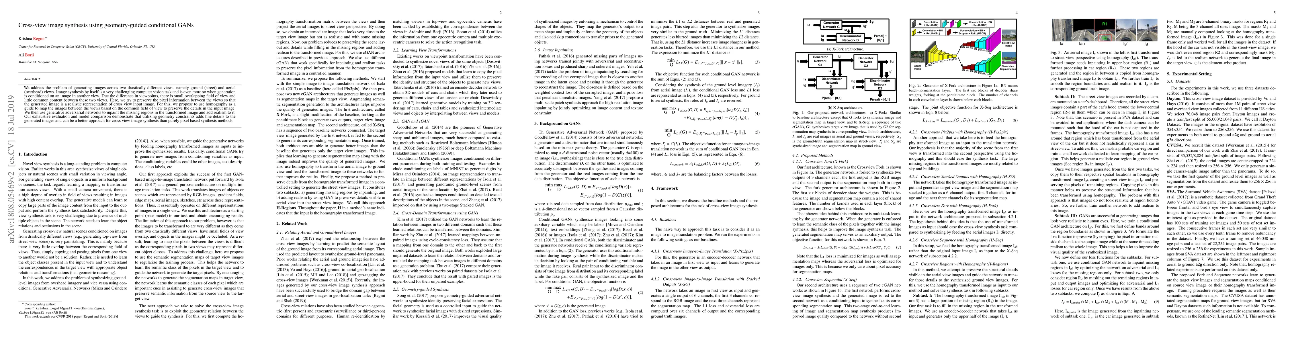 This paper proposes a geometry-guided conditional GAN approach to synthesize images across ground and aerial views, leveraging homography to map images based on common fields of view. The method inpaints missing regions and adds realism, demonstrating improved detail preservation compared to pixel-based synthesis methods.