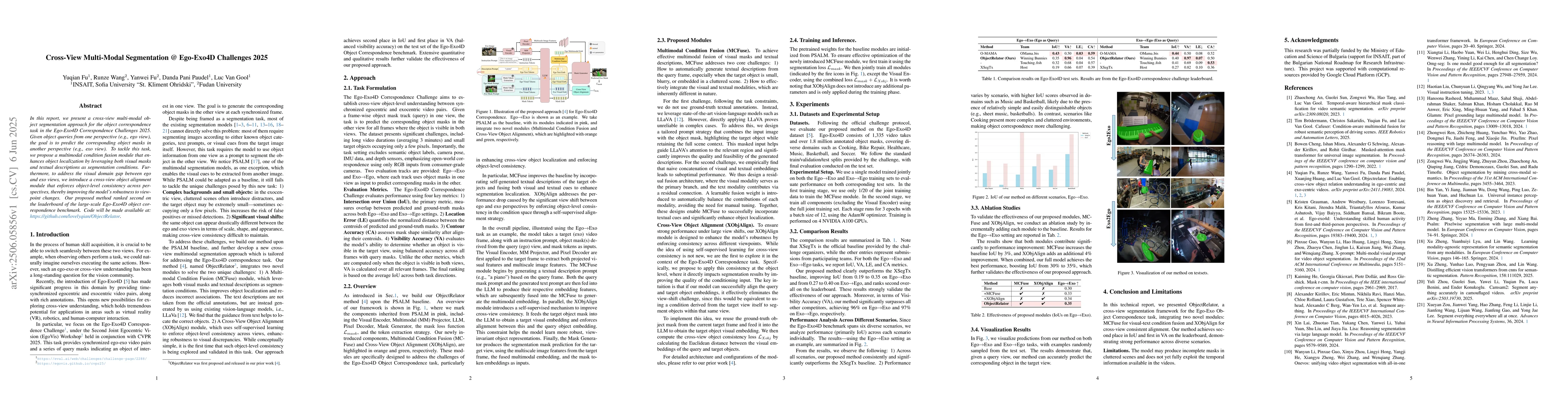 In this report, we present a cross-view multi-modal object segmentation approach for the object correspondence task in the Ego-Exo4D Correspondence Challenges 2025. Given object queries from one perspective (e.g., ego view), the goal is to predict the corresponding object masks in another perspective (e.g., exo view). To tackle this task, we propose a multimodal condition fusion module that enhances object localization by leveraging both visual masks and textual descriptions as segmentation conditions. Furthermore, to address the visual domain gap between ego and exo views, we introduce a cross-view object alignment module that enforces object-level consistency across perspectives, thereby improving the model's robustness to viewpoint changes. Our proposed method ranked second on the leaderboard of the large-scale Ego-Exo4D object correspondence benchmark. Code will be made available at https://github.com/lovelyqian/ObjectRelator.