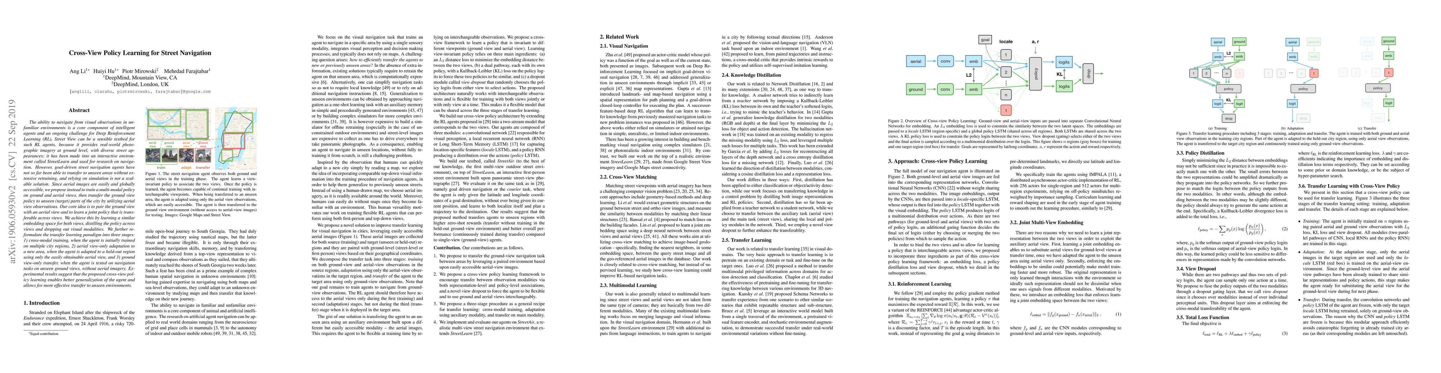 This paper proposes a method for cross-view policy learning to enable street navigation agents to generalize better and transfer to unseen environments. The approach involves training a multi-modal policy using both ground and aerial views, achieving a transferable policy through joint embedding and distillation, and demonstrating improved transferability through a three-stage transfer learning paradigm.