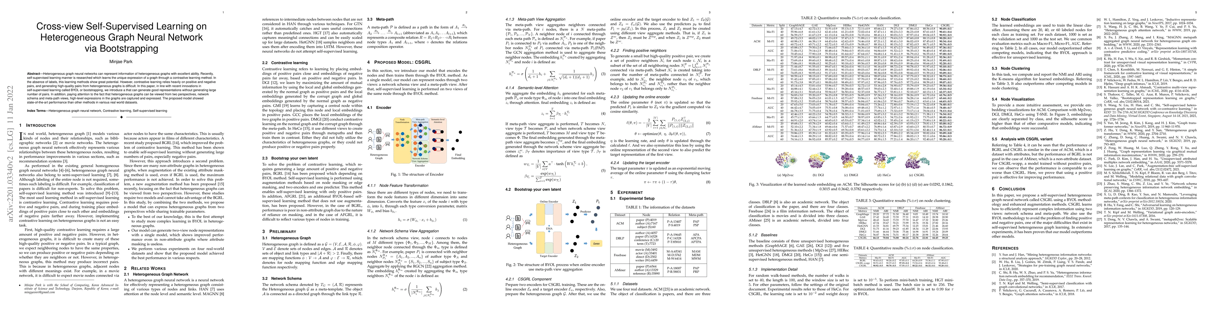 Heterogeneous graph neural networks can represent information of heterogeneous graphs with excellent ability. Recently, self-supervised learning manner is researched which learns the unique expression of a graph through a contrastive learning method. In the absence of labels, this learning methods show great potential. However, contrastive learning relies heavily on positive and negative pairs, and generating high-quality pairs from heterogeneous graphs is difficult. In this paper, in line with recent innovations in self-supervised learning called BYOL or bootstrapping, we introduce a that can generate good representations without generating large number of pairs. In addition, paying attention to the fact that heterogeneous graphs can be viewed from two perspectives, network schema and meta-path views, high-level expressions in the graphs are captured and expressed. The proposed model showed state-of-the-art performance than other methods in various real world datasets.