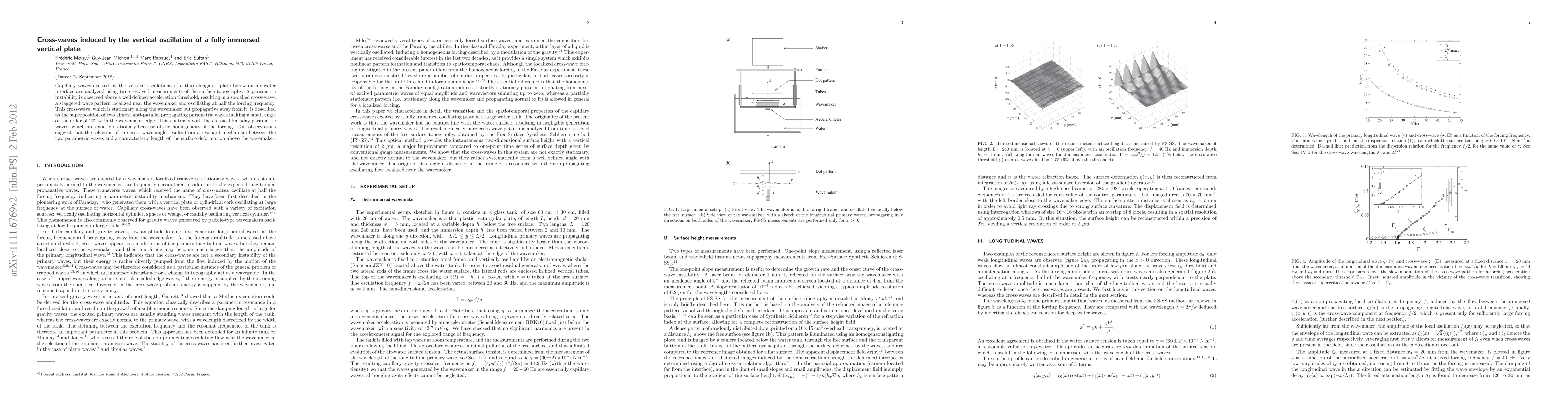 Capillary waves excited by the vertical oscillations of a thin elongated plate below an air-water interface are analyzed using time-resolved measurements of the surface topography. A parametric instability is observed above a well defined acceleration threshold, resulting in a so-called cross-wave, a staggered wave pattern localized near the wavemaker and oscillating at half the forcing frequency. This cross-wave, which is stationary along the wavemaker but propagative away from it, is described as the superposition of two almost anti-parallel propagating parametric waves making a small angle of the order of $20^\mathrm{o}$ with the wavemaker edge. This contrasts with the classical Faraday parametric waves, which are exactly stationnary because of the homogeneity of the forcing. Our observations suggest that the selection of the cross-wave angle results from a resonant mechanism between the two parametric waves and a characteristic length of the surface deformation above the wavemaker.