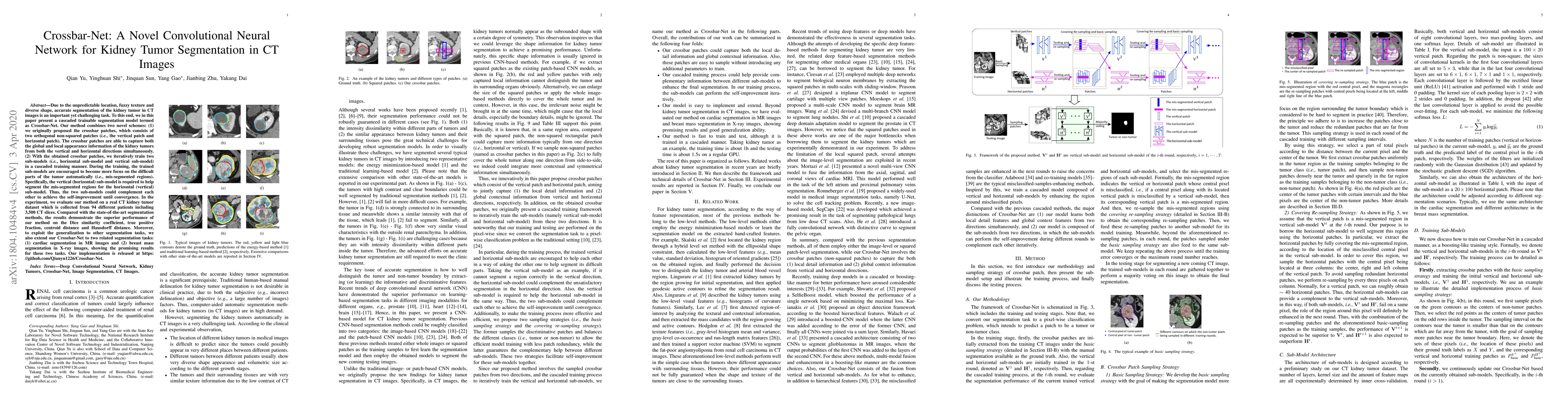 Crossbar-Net introduces a novel convolutional network for segmenting kidney tumors in CT images using orthogonal non-squared patches, achieving superior results compared to state-of-the-art methods in terms of dice ratio score and other metrics. The method also shows promising generalization to cardiac segmentation tasks.