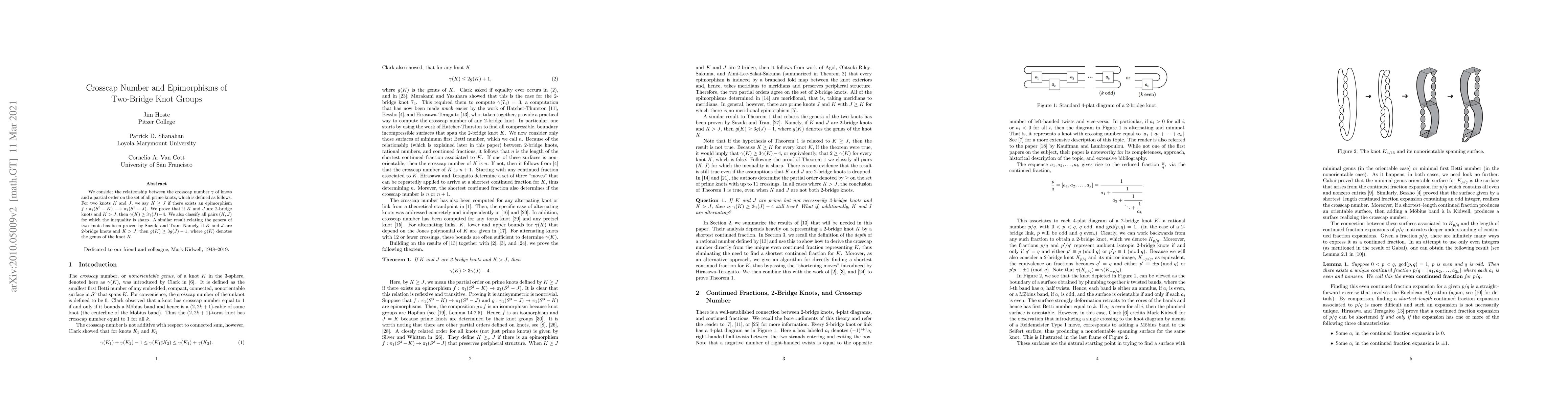 We consider the relationship between the crosscap number $\gamma$ of knots and a partial order on the set of all prime knots, which is defined as follows. For two knots $K$ and $J$, we say $K \geq J$ if there exists an epimorphism $f:\pi_1(S^3-K) \longrightarrow \pi_1(S^3-J)$. We prove that if $K$ and $J$ are 2-bridge knots and $K> J$, then $\gamma(K) \geq 3\gamma(J) -4$. We also classify all pairs $(K,J)$ for which the inequality is sharp. A similar result relating the genera of two knots has been proven by Suzuki and Tran. Namely, if $K$ and $J$ are 2-bridge knots and $K >J$, then $g(K) \geq 3 g(J)-1$, where $g(K)$ denotes the genus of the knot $K$.