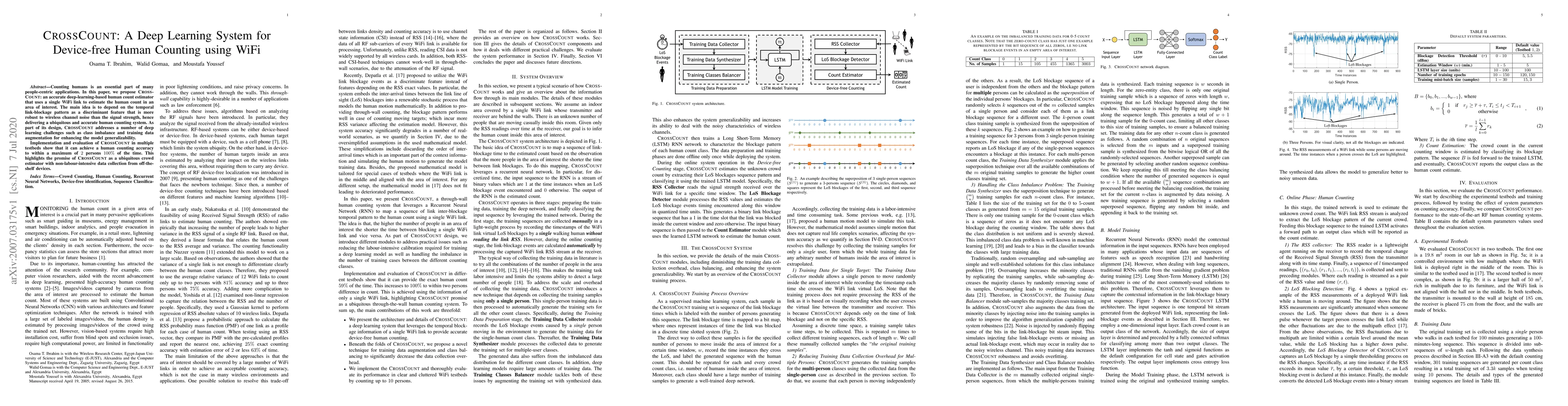 CrossCount is a deep learning system that uses a single WiFi link to accurately estimate human counts in an area by analyzing temporal link-blockage patterns. It addresses challenges like class imbalance and achieves high accuracy with minimal human intervention, demonstrating potential as a ubiquitous crowd estimator.