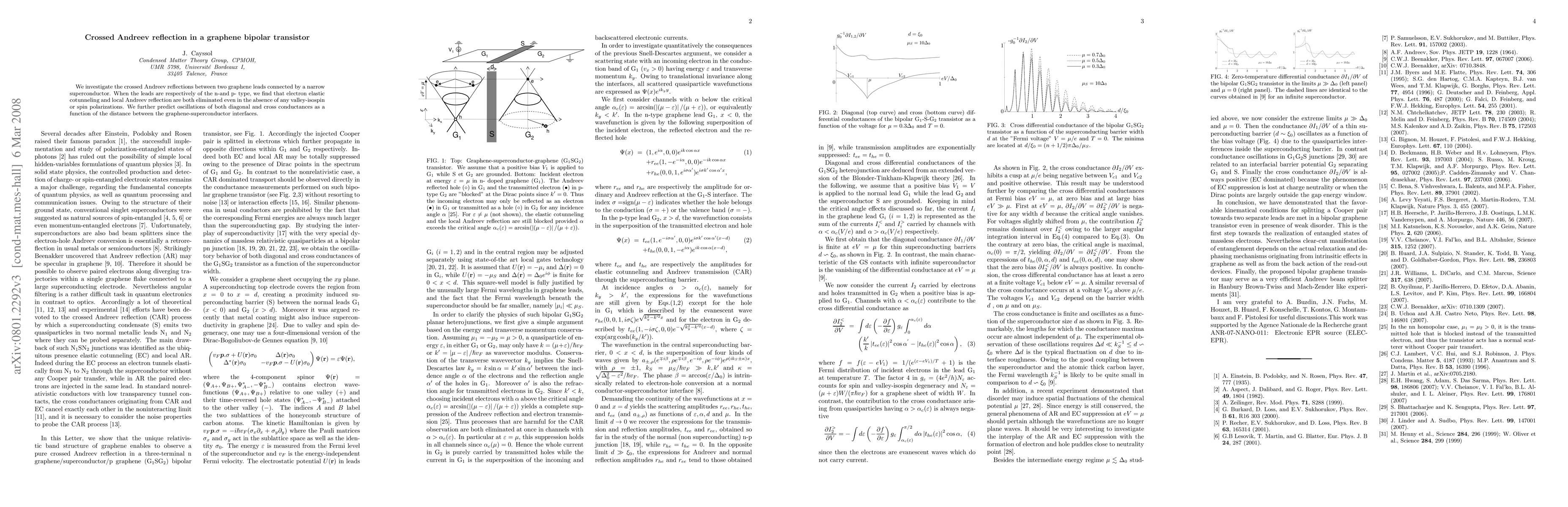 Summary: This study explores crossed Andreev reflections in a graphene bipolar transistor connected to superconducting leads, revealing the elimination of electron elastic cotunneling and local Andreev reflection, and predicting oscillatory conductance variations based on the distance between graphene-superconductor interfaces.