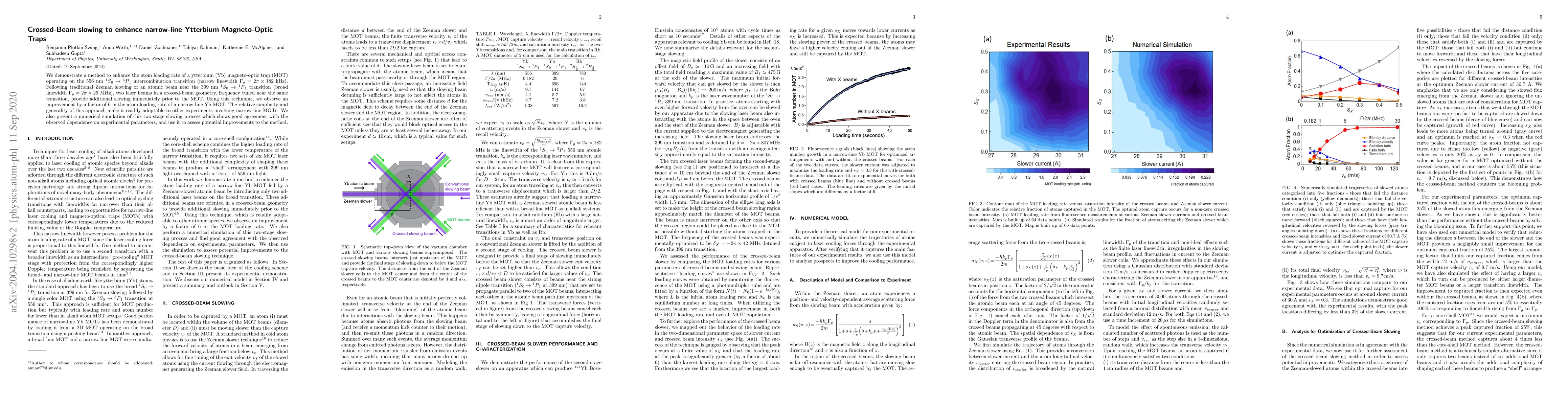 This paper describes a method to significantly enhance the atom loading rate of a narrow-line ytterbium magneto-optic trap by implementing a two-stage atomic beam slowing technique, achieving a sixfold improvement. The technique employs a crossed-beam geometry for additional slowing before the trap.