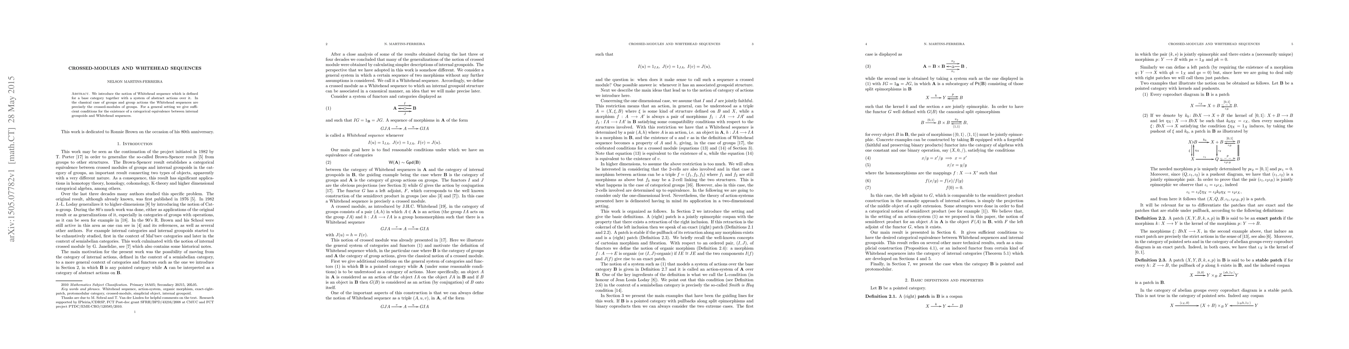 We introduce the notion of Whitehead sequence which is defined for a base category together with a system of abstract actions over it. In the classical case of groups and group actions the Whitehead sequences are precisely the crossed-modules of groups. For a general setting we give sufficient conditions for the existence of a categorical equivalence between internal groupoids and Whitehead sequences.