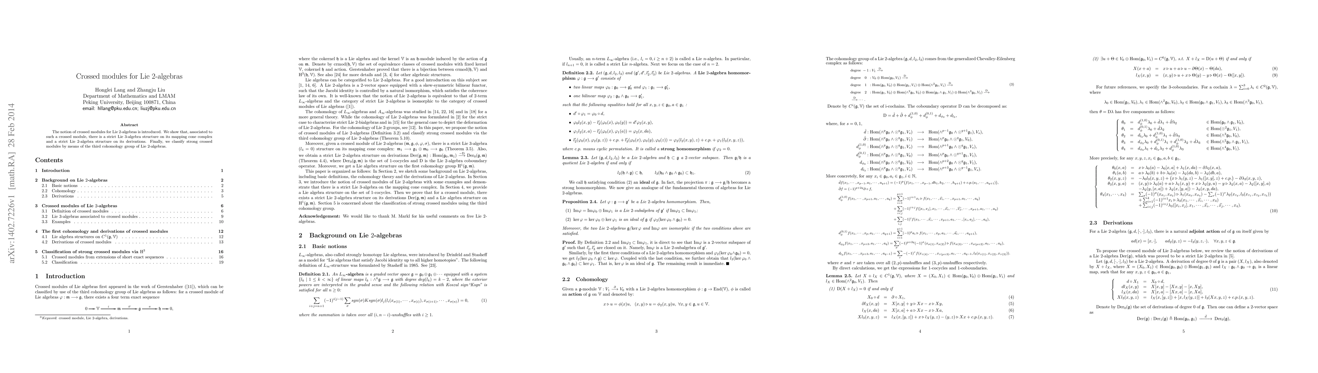This paper introduces crossed modules for Lie 2-algebras, demonstrating the existence of a strict Lie 3-algebra structure on their mapping cone complex and a strict Lie 2-algebra on their derivations. The classification of strong crossed modules is achieved using the third cohomology group of Lie 2-algebras.