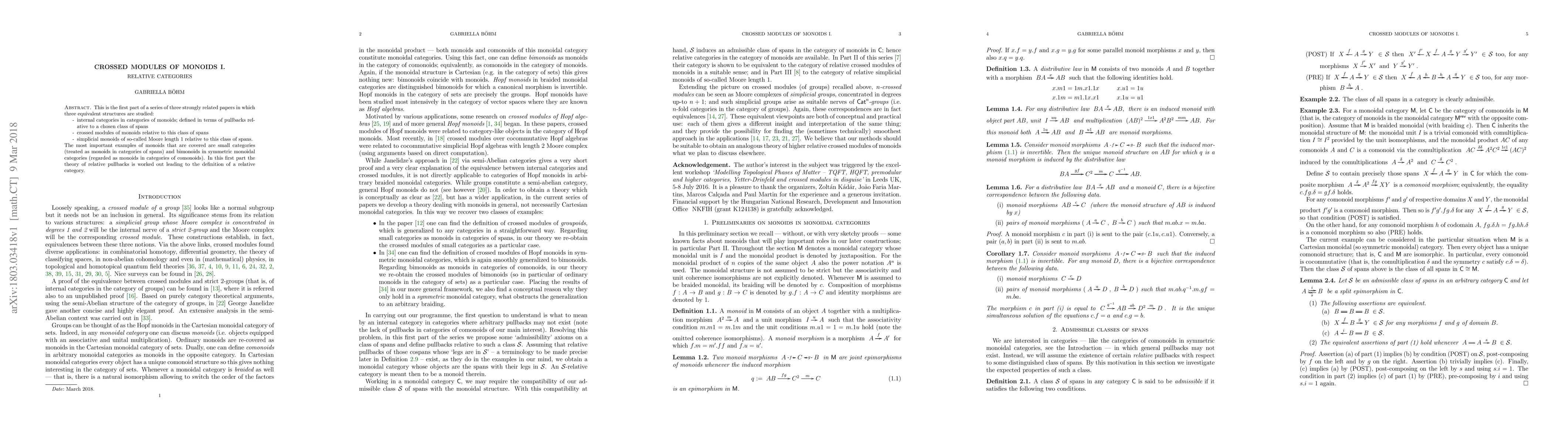 This paper introduces the concept of relative categories within the context of crossed modules of monoids, defining them through relative pullbacks and examining their equivalence to simplicial monoids of Moore length 1 and to internal categories in categories of monoids. The foundational theory of relative pullbacks underpins the study of monoids, particularly small categories and bimonoids in symmetric monoidal categories.