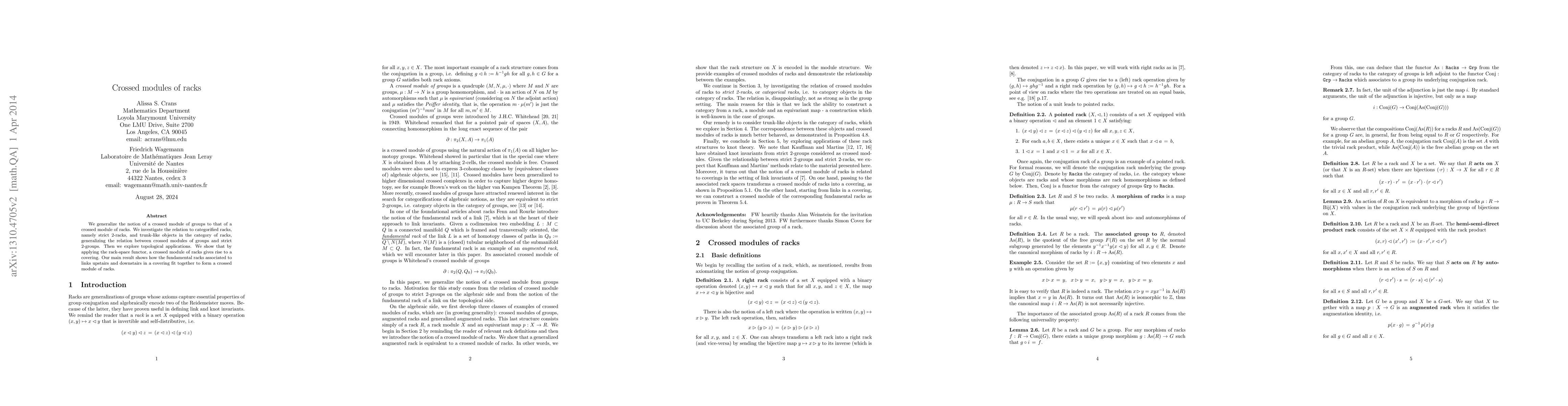 This paper generalizes the concept of crossed modules from groups to racks, exploring their relationship with categorified racks and strict 2-racks. It demonstrates that crossed modules of racks can be applied to topology, showing they induce coverings and proving how fundamental racks related to links form a crossed module.