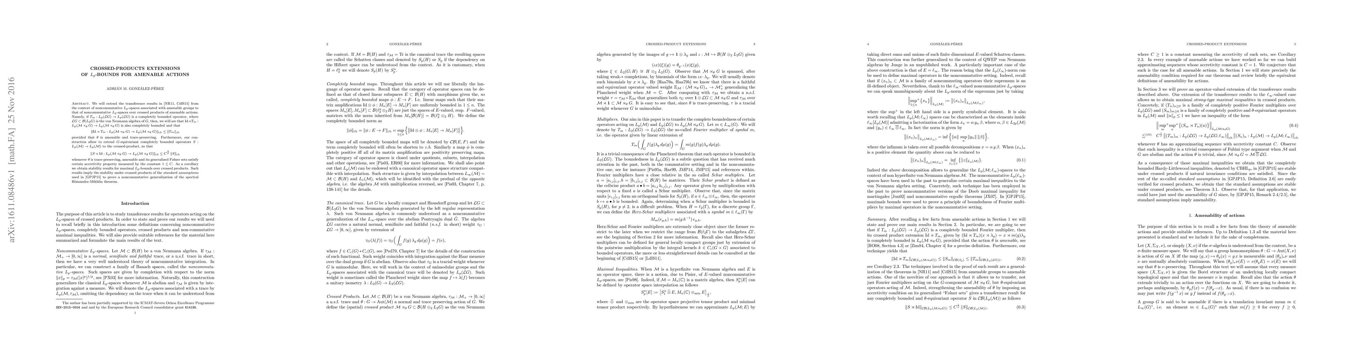 We will extend earlier transference results of Neuwirth and Ricard from the context of noncommutative $L_p$-spaces associated with amenable groups to that of noncommutative $L_p$-spaces over crossed products of amenable and trace-preserving actions. Namely, if $T_m:L_p(\mathcal{L} G) \rightarrow L_p(\mathcal{L} G)$ is a completely bounded Fourier multiplier, where $\mathcal{L} G \subset \mathcal{B}(L_2 G)$ is the von Neumann algebra of $G$, we will see that $\mathrm{Id} \rtimes T_m: L_p(\mathcal{M} \rtimes_\theta G) \rightarrow L_p(\mathcal{M} \rtimes_\theta G)$ is also completely bounded and that $$ \| \mathrm{Id} \rtimes T_m: L_p(\mathcal{M} \rtimes_\theta G) \rightarrow L_p(\mathcal{M} \rtimes_\theta G) \|_{\mathrm{cb}} \leq \| T_m \|_{\mathrm{cb}} $$ provided that $\theta$ is amenable and trace-preserving. Furthermore, our construction allow to extend $G$-equivariant completely bounded operators $S: L_p(\mathcal{M}) \rightarrow L_p(\mathcal{M})$ to the crossed-product, so that $$ \|S \rtimes \mathrm{Id}: L_p(\mathcal{M} \rtimes_\theta G) \rightarrow L_p(\mathcal{M} \rtimes_\theta G) \|_{\mathrm{cb}} \leq C^\frac{1}{p} \, \| S \|_{\mathrm{cb}} $$ whenever $\theta$ is trace-preserving, amenable and its generalized F{\o}lner sets satisfy certain accretivity property measured by the constant $1 \leq C$. As a corollary, we will obtain stability results for maximal $L_p$-bounds over crossed products. Such results imply the stability of certain assumptions recently used to prove a noncommutative generalization of the spectral H\"omander-Mikhlin theorem.