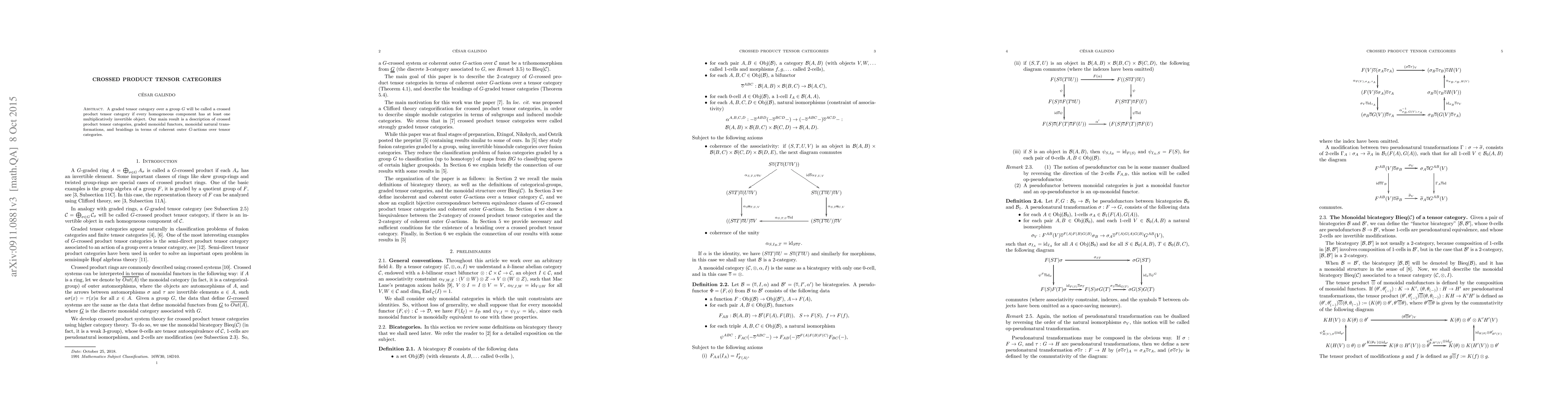 Summary: This paper defines crossed product tensor categories, focusing on graded tensor categories over a group $G$ with invertible objects in each component. The authors describe these categories, functors, transformations, and braiding in terms of coherent outer $G$-actions over tensor categories.