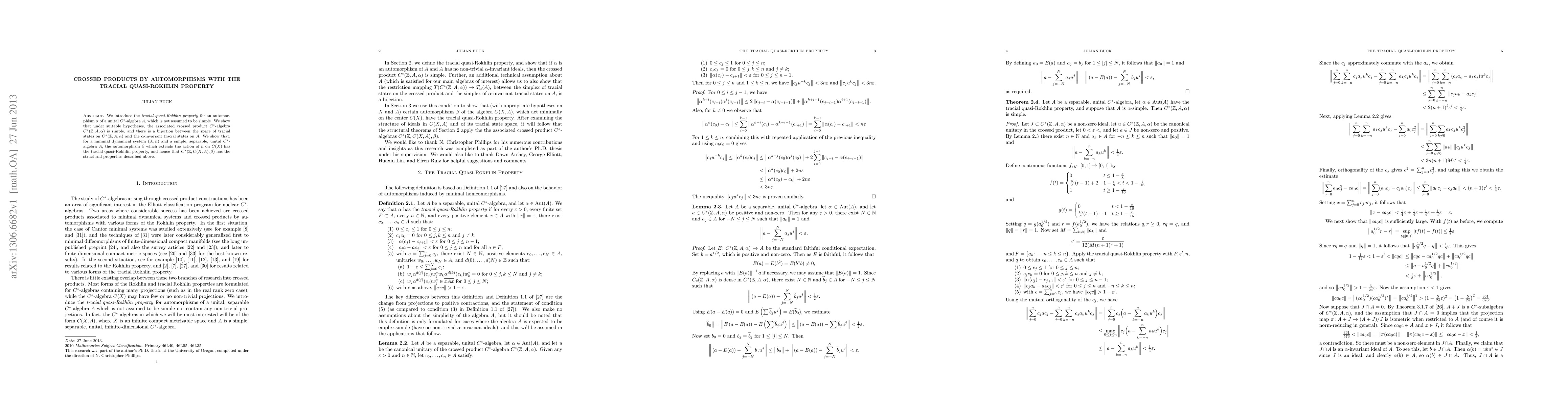 This paper introduces the tracial quasi-Rokhlin property for automorphisms of unital C*-algebras, demonstrating that under certain conditions, the associated crossed product C*-algebra is simple and maintains a bijection between its tracial states and invariant tracial states on the original algebra.