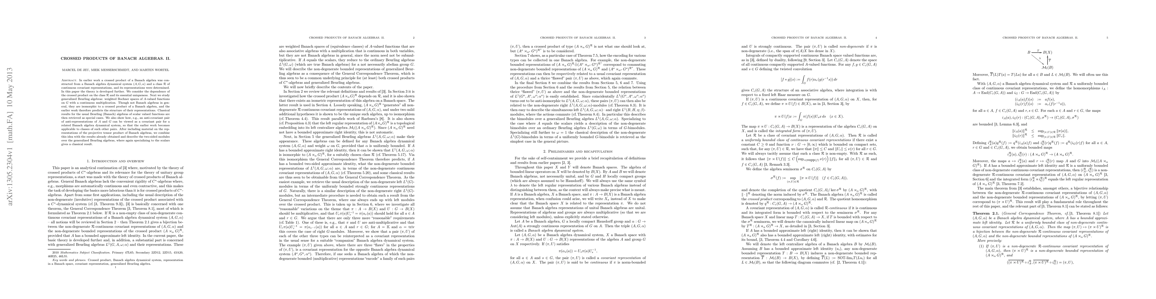 In earlier work a crossed product of a Banach algebra was constructed from a Banach algebra dynamical system $(A,G,\alpha)$ and a class $\mathcal{R}$ of continuous covariant representations, and its representations were determined. In this paper the theory is developed further. We consider the dependence of the crossed product on the class $\mathcal{R}$ and its essential uniqueness. Next we study generalized Beurling algebras: weighted Bochner spaces of $A$-valued functions on $G$ with a continuous multiplication. Though not Banach algebras in general, they are isomorphic to a crossed product of a Banach algebra, and the earlier work therefore predicts the structure of their representations. Classical results for the usual Beurling (Banach) algebras of scalar valued functions are then retrieved as special cases. We also show how, e.g., an anti-covariant pair of anti-representations of $A$ and $G$ can be viewed as a covariant pair for a related Banach algebra dynamical system, so that the earlier work becomes applicable to classes of such other pairs. After including material on the representations of the projective tensor product of Banach algebras, we combine this idea with the results already obtained and describe the two-sided modules over the generalized Beurling algebras, where again specializing to the scalars gives a classical result.