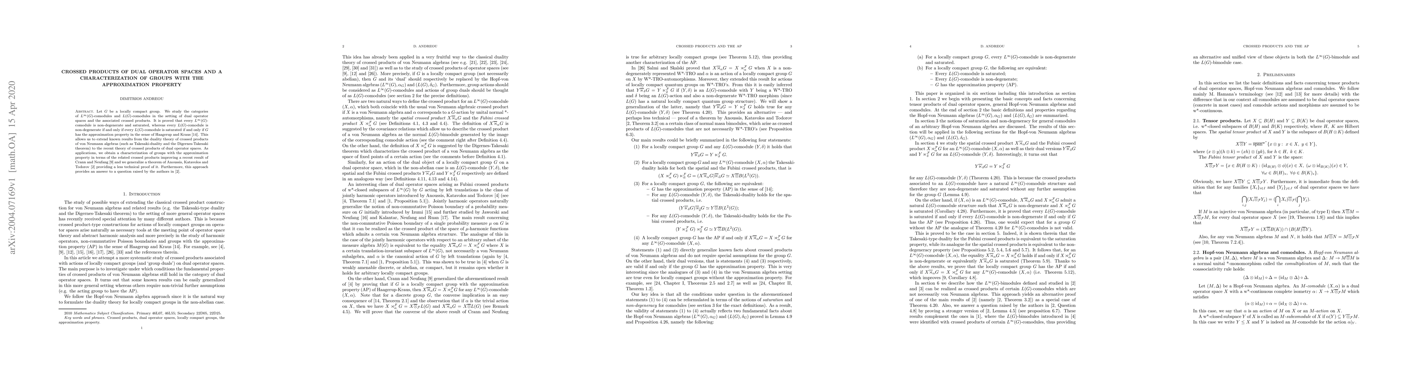 Let $ G $ be a locally compact group. We study the categories of $ L^{\infty}(G) $-comodules and $ L(G) $-comodules in the setting of dual operator spaces and the associated crossed products. It is proved that every $ L^{\infty}(G) $-comodule is non-degenerate and saturated, whereas every $ L(G) $-comodule is non-degenerate if and only if every $ L(G) $-comodule is saturated if and only if $ G $ has the approximation property in the sense of Haagerup and Kraus [14]. This allows us to extend known results from the duality theory of crossed products of von Neumann algebras (such as Takesaki-duality and the Digernes-Takesaki theorem) to the recent theory of crossed products of dual operator spaces. As applications, we obtain a characterization of groups with the approximation property in terms of the related crossed products improving a recent result of Crann and Neufang [9] and we generalize a theorem of Anoussis, Katavolos and Todorov [2] providing a less technical proof of it. Furthermore, this approach provides an answer to a question raised by the authors in [2].