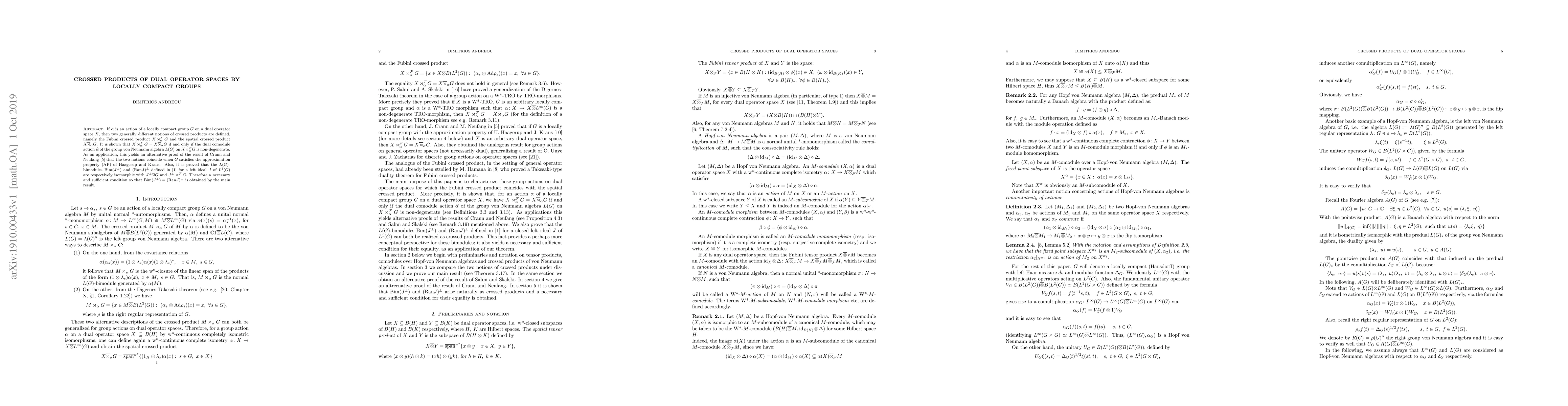 For an action $\alpha$ of a locally compact group $G$ on a dual operator space $X$ by w*-continuous completely isometric isomorphisms one can define two generally different notions of crossed products, namely the Fubini crossed product $X\rtimes_{\alpha}^{F}G$ and the spatial crossed product $X\overline{\rtimes}_{\alpha} G$. It is shown that $X\rtimes_{\alpha}^{F}G=X\overline{\rtimes}_{\alpha} G$ if and only if the dual comodule action $\widehat{\alpha}$ of the group von Neumann algebra $L(G)$ on the Fubini crossed product of $X\rtimes_{\alpha}^{F}G$ is non-degenerate. As an application, this yields an alternative proof of the result of Crann and Neufang that the two notions coincide when G satisfies the approximation property (AP) of Haagerup and Kraus. Also, it is proved that the $L(G)$-bimodules $Bim(J^{\perp})$ and $Ran(J)^{\perp}$ defined by Anoussis, Katavolos and Todorov for a left closed ideal J of $L^{1}(G)$ can be identified respectively with a spatial crossed product and a Fubini crossed product of the annihilator of $J$ by $G$. Therefore a necessary and sufficient condition so that $Bim(J^{\perp})=Ran(J)^{\perp}$ is obtained by the main result.
