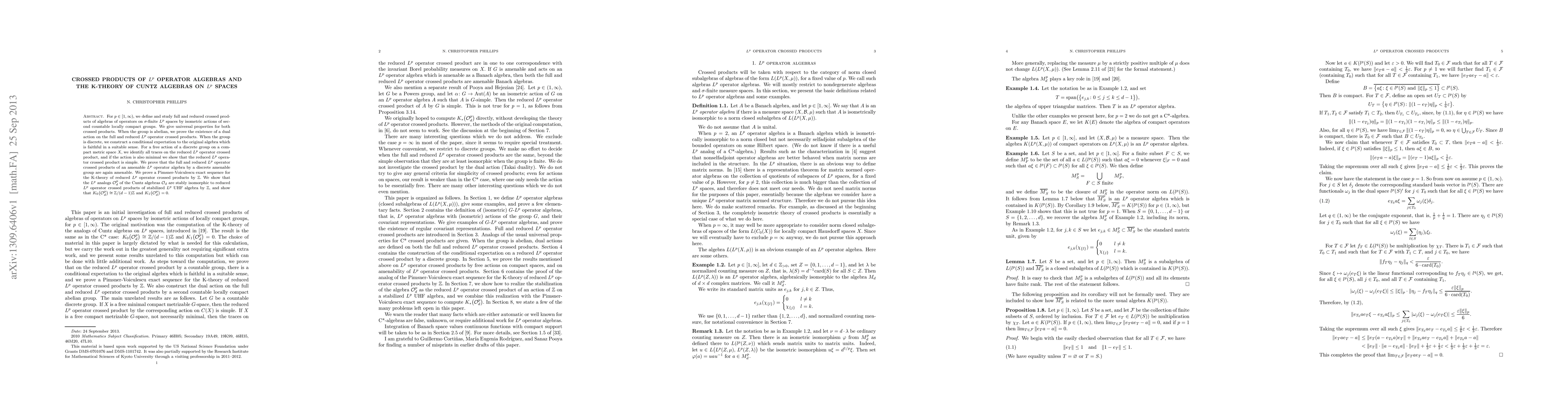 This paper investigates full and reduced crossed products of $L^p$ operator algebras by isometric actions of second countable locally compact groups. It establishes universal properties, dual actions for abelian groups, and conditional expectations for discrete groups. It also explores the K-theory of $L^p$ operator crossed products and Cuntz algebras, proving exact sequences and K-theory group isomorphisms.