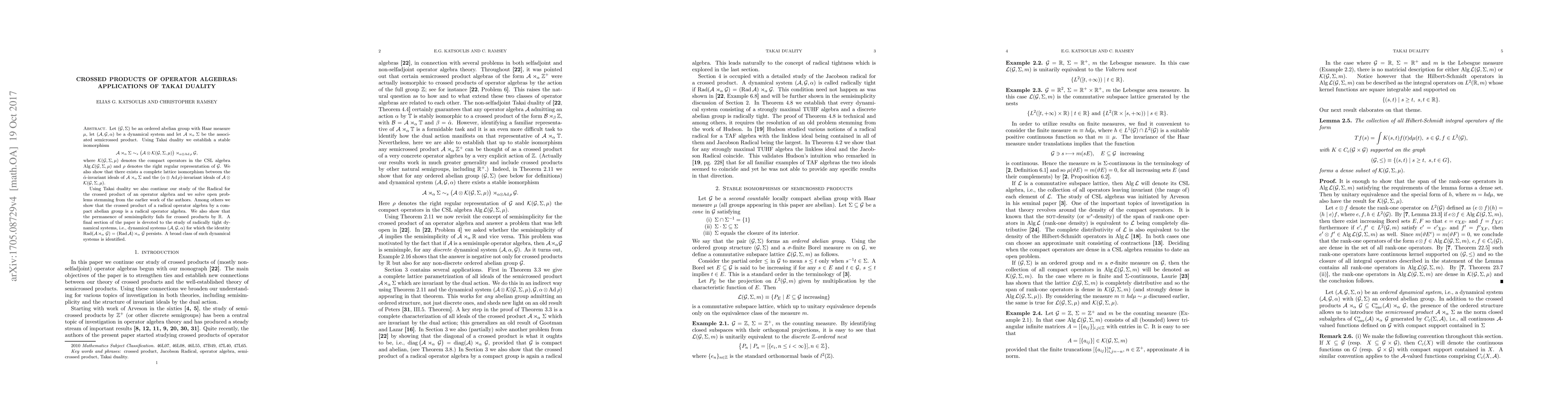 Let $(\mathcal G, \Sigma)$ be an ordered abelian group with Haar measure $\mu$, let $(\mathcal A, \mathcal G, \alpha)$ be a dynamical system and let $\mathcal A\rtimes_{\alpha} \Sigma $ be the associated semicrossed product. Using Takai duality we establish a stable isomorphism \[ \mathcal A\rtimes_{\alpha} \Sigma \sim_{s} \big(\mathcal A \otimes \mathcal K(\mathcal G, \Sigma, \mu)\big)\rtimes_{\alpha\otimes {\rm Ad}\: \rho} \mathcal G, \] where $\mathcal K(\mathcal G, \Sigma, \mu)$ denotes the compact operators in the CSL algebra ${\rm Alg}\:\mathcal L(\mathcal G, \Sigma, \mu)$ and $\rho$ denotes the right regular representation of $\mathcal G$. We also show that there exists a complete lattice isomorphism between the $\hat{\alpha}$-invariant ideals of $\mathcal A\rtimes_{\alpha} \Sigma$ and the $(\alpha\otimes {\rm Ad}\: \rho)$-invariant ideals of $\mathcal A \otimes \mathcal K(\mathcal G, \Sigma, \mu)$. Using Takai duality we also continue our study of the Radical for the crossed product of an operator algebra and we solve open problems stemming from the earlier work of the authors. Among others we show that the crossed product of a radical operator algebra by a compact abelian group is a radical operator algebra. We also show that the permanence of semisimplicity fails for crossed products by $\mathbb R$. A final section of the paper is devoted to the study of radically tight dynamical systems, i.e., dynamical systems $(\mathcal A, \mathcal G, \alpha)$ for which the identity ${\rm Rad}(\mathcal A \rtimes_\alpha \mathcal G)=({\rm Rad}\:\mathcal A) \rtimes_\alpha \mathcal G$ persists. A broad class of such dynamical systems is identified.