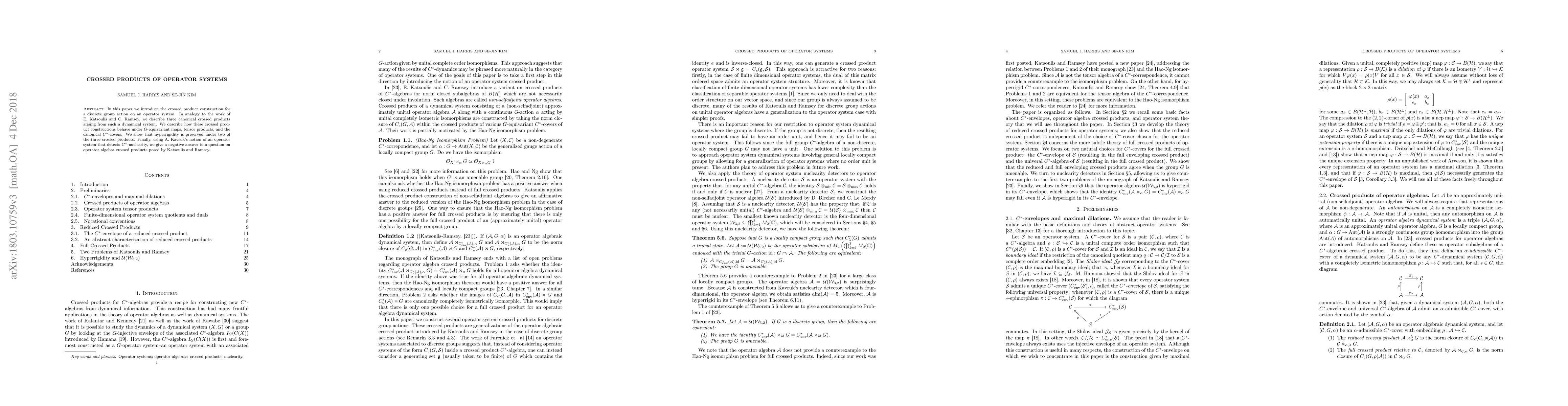 This paper introduces crossed product constructions for discrete group actions on operator systems, explores their behavior under $G$-equivariant maps and tensor products, and shows hyperrigidity preservation in two of the three crossed products. It also uses Kavruk's operator system to answer a question on $C^*$-nuclearity negatively.