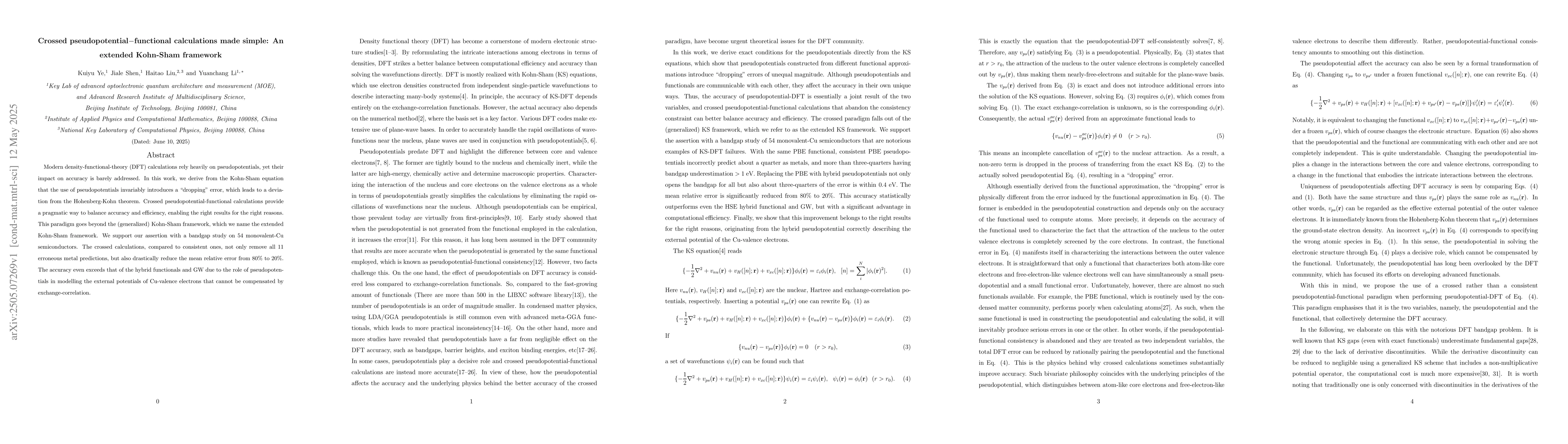 Modern density-functional-theory (DFT) calculations rely heavily on pseudopotentials, yet their impact on accuracy is barely addressed. In this work, we derive from the Kohn-Sham equation that the use of pseudopotentials invariably introduces a ``dropping" error, which leads to a deviation from the Hohenberg-Kohn theorem. Crossed pseudopotential-functional calculations provide a pragmatic way to balance accuracy and efficiency, enabling the right results for the right reasons. This paradigm goes beyond the (generalized) Kohn-Sham framework, which we name the extended Kohn-Sham framework. We support our assertion with a bandgap study on 54 monovalent-Cu semiconductors. The crossed calculations, compared to consistent ones, not only remove all 11 erroneous metal predictions, but also drastically reduce the mean relative error from 80\% to 20\%. The accuracy even exceeds that of the hybrid functionals and GW due to the role of pseudopotentials in modelling the external potentials of Cu-valence electrons that cannot be compensated by exchange-correlation.