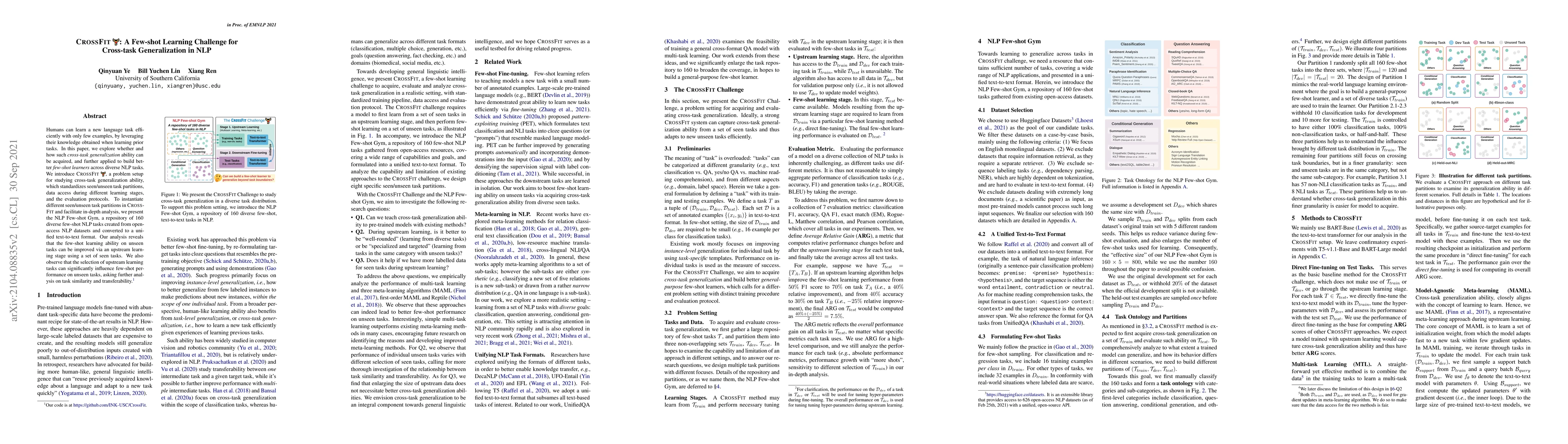 This paper introduces CrossFit, a framework to study cross-task generalization in NLP, and the NLP Few-shot Gym to facilitate this research. The study finds that few-shot learning performance on unseen tasks can be enhanced by prior learning from related tasks, highlighting the importance of task selection for effective transfer learning.