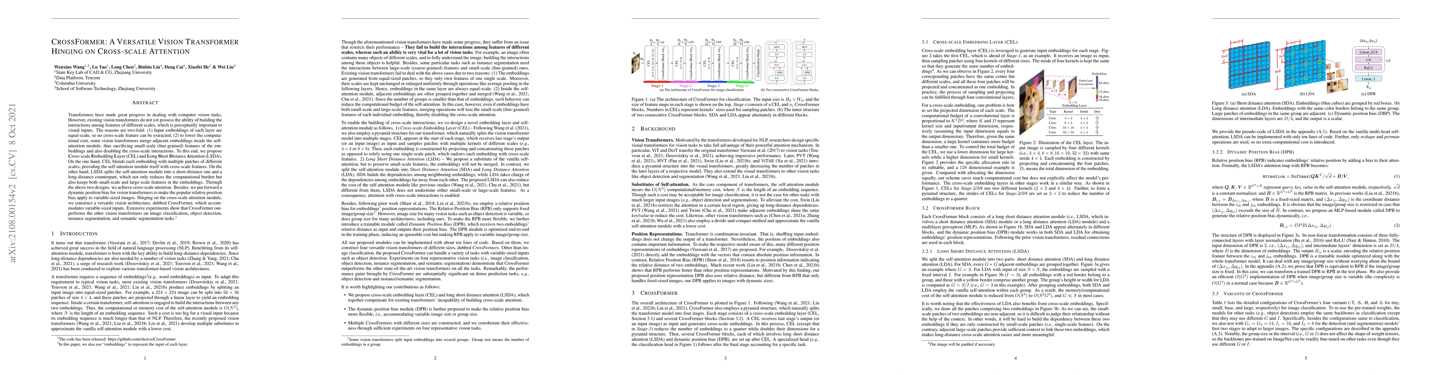 CrossFormer introduces a versatile vision transformer with cross-scale attention using Cross-scale Embedding Layer and Long Short Distance Attention to enhance feature interactions across different scales, outperforming other vision transformers on various computer vision tasks. The architecture accommodates variable-sized inputs and includes a dynamic position bias for relative position encoding.