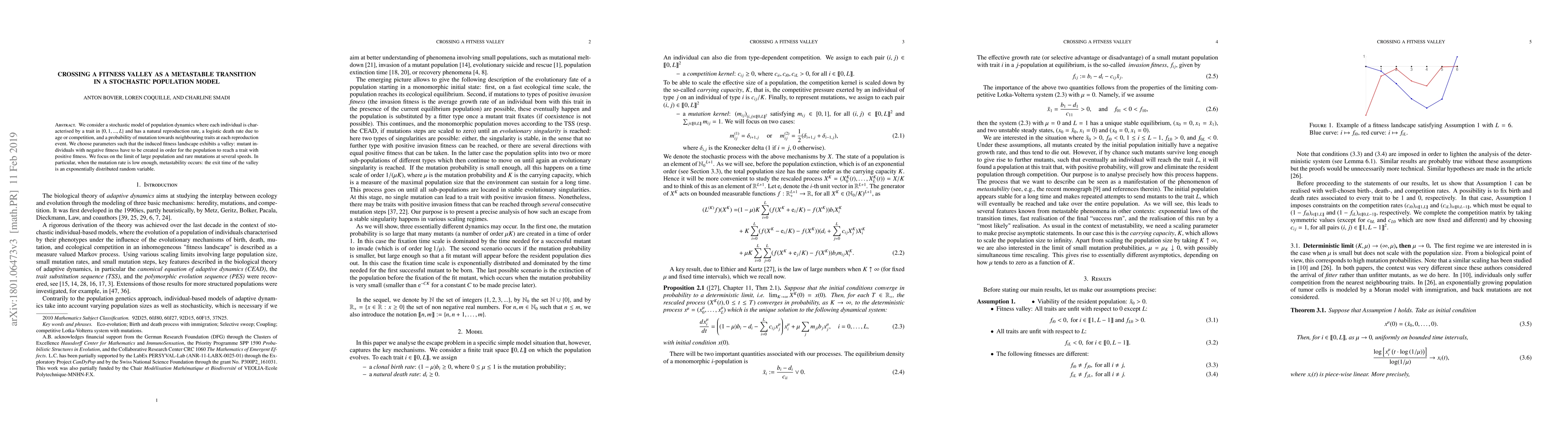 This paper explores a stochastic population model where individuals transition through traits, and the fitness landscape features a valley that must be crossed for positive fitness traits to emerge. Under low mutation rates and large population sizes, the model exhibits metastability, with the time to exit the valley following an exponentially distributed random process.