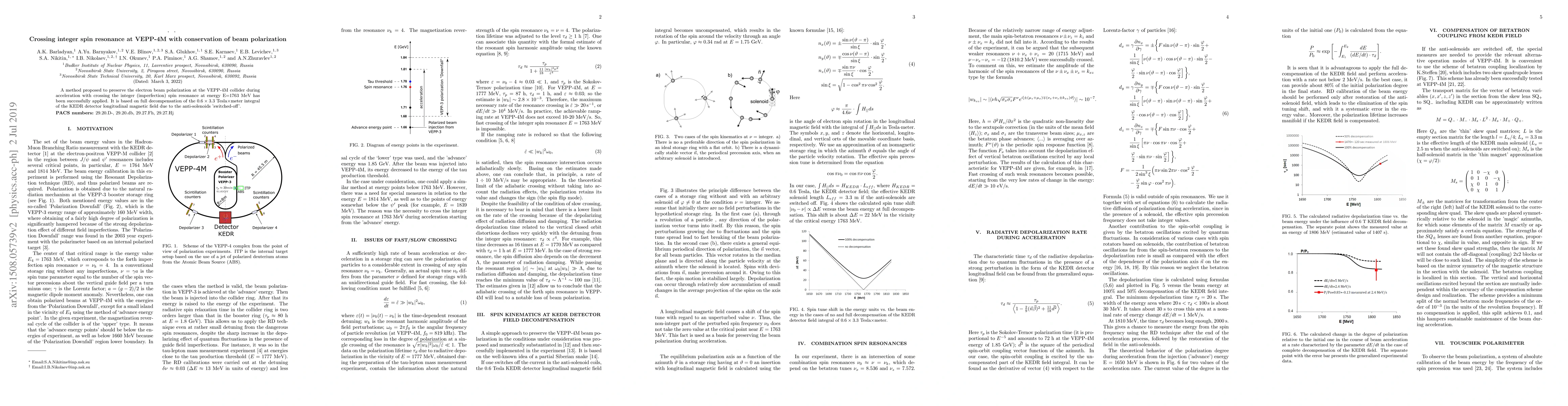Summary: A method to maintain electron beam polarization at VEPP-4M during acceleration through integer spin resonance was successfully implemented by deactivating anti-solenoids, effectively nullifying the KEDR detector's longitudinal magnetic field. This approach successfully avoids polarization loss despite crossing the resonance at 1763 MeV.