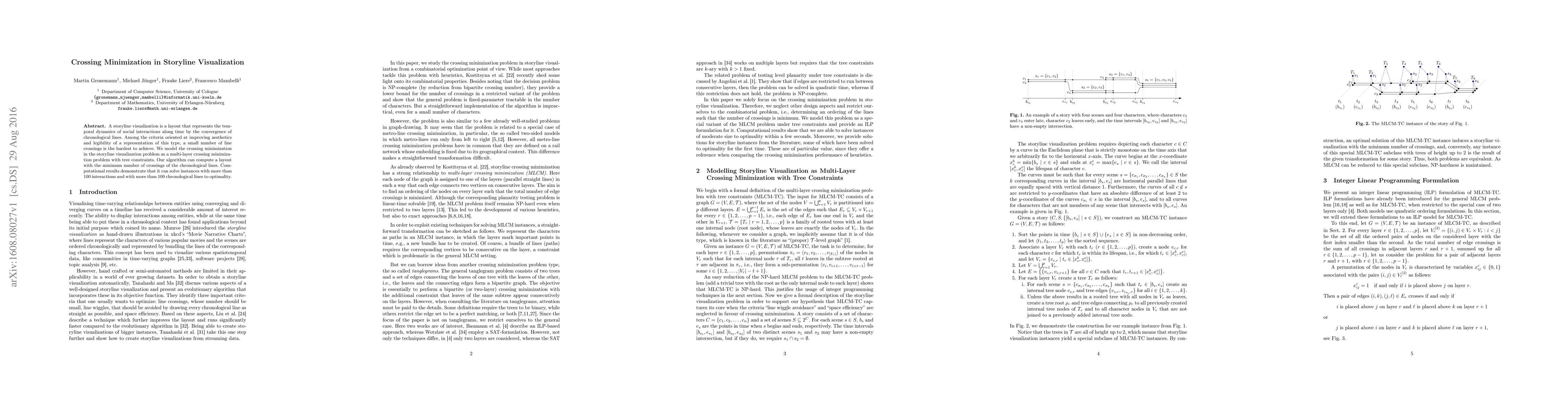 This paper proposes an algorithm for minimizing line crossings in storyline visualizations, which represent temporal dynamics of social interactions. The algorithm effectively solves instances with over 100 interactions and 100 chronological lines, achieving optimal layouts with minimal crossings.
