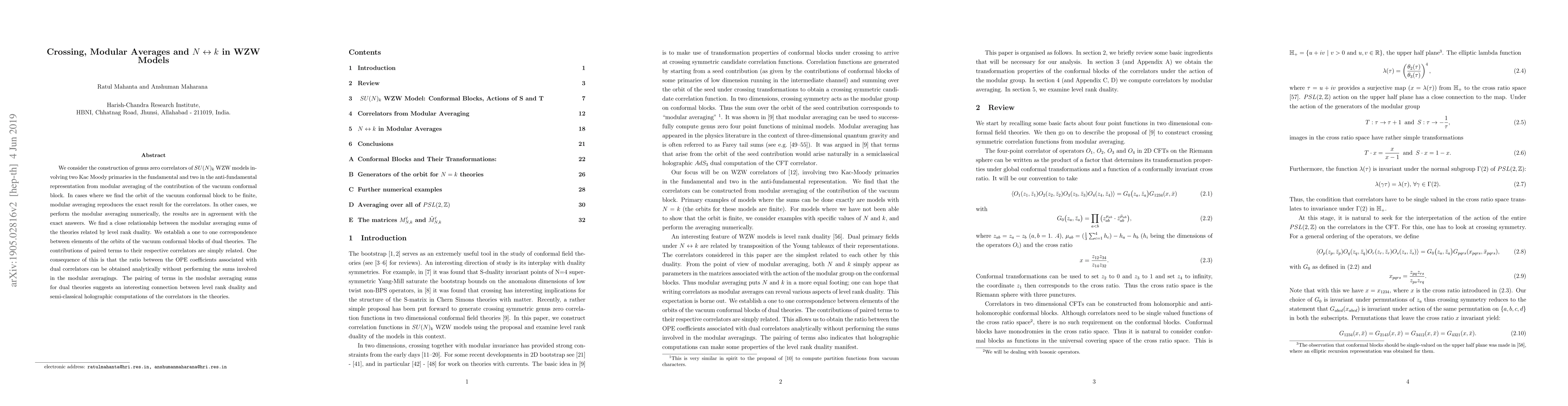 We consider the construction of genus zero correlators of $SU(N)_k$ WZW models involving two Kac Moody primaries in the fundamental and two in the anti-fundamental representation from modular averaging of the contribution of the vacuum conformal block. In cases where we find the orbit of the vacuum conformal block to be finite, modular averaging reproduces the exact result for the correlators. In other cases, we perform the modular averaging numerically, the results are in agreement with the exact answers. We find a close relationship between the modular averaging sums of the theories related by level rank duality. We establish a one to one correspondence between elements of the orbits of the vacuum conformal blocks of dual theories. The contributions of paired terms to their respective correlators are simply related. One consequence of this is that the ratio between the OPE coefficients associated with dual correlators can be obtained analytically without performing the sums involved in the modular averagings. The pairing of terms in the modular averaging sums for dual theories suggests an interesting connection between level rank duality and semi-classical holographic computations of the correlators in the theories.
