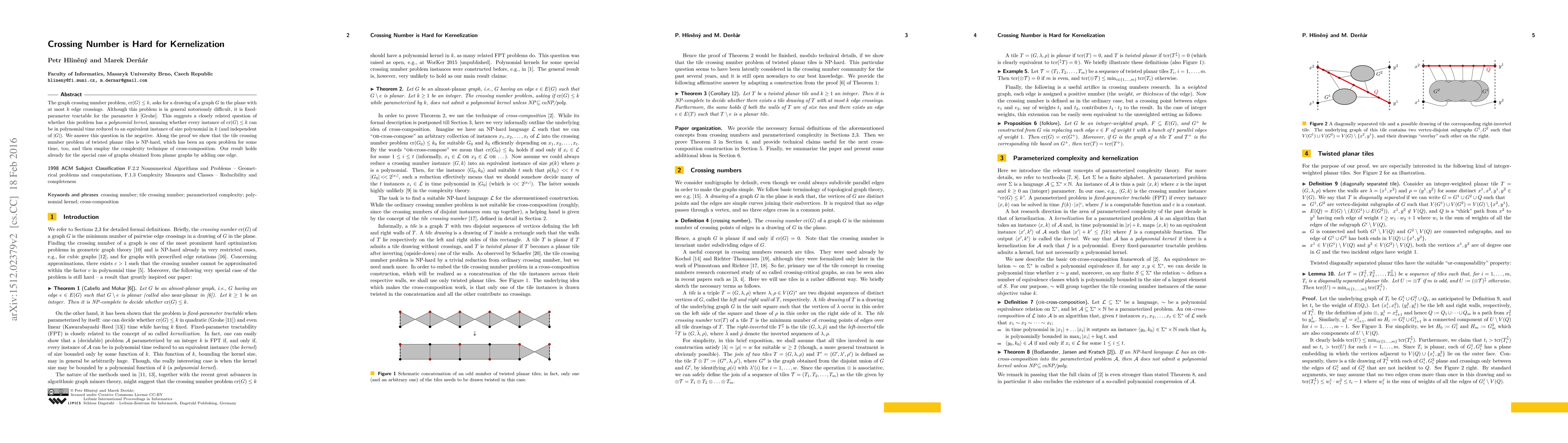 The paper proves that the graph crossing number problem does not have a polynomial kernel, even for graphs obtained by adding a single edge to planar graphs. Additionally, it demonstrates the NP-hardness of the tile crossing number problem for twisted planar tiles using cross-composition.
