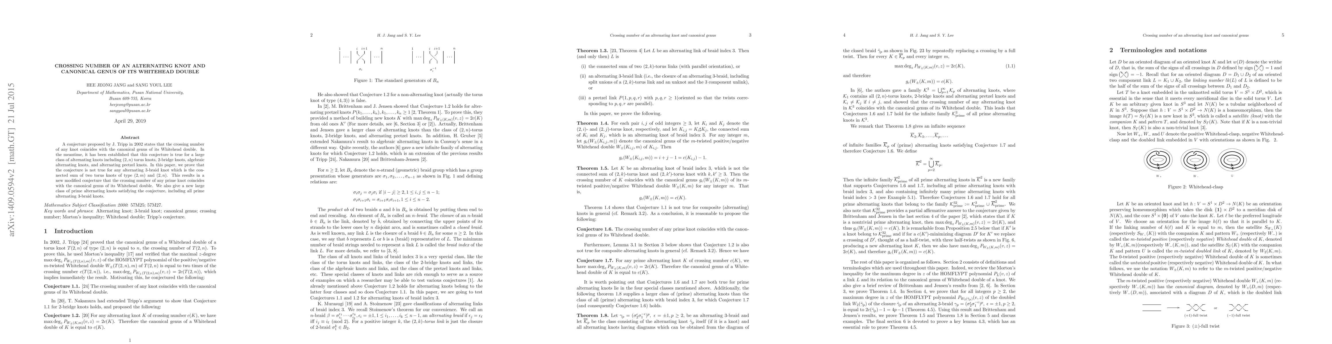 A conjecture proposed by J. Tripp in 2002 states that the crossing number of any knot coincides with the canonical genus of its Whitehead double. In the meantime, it has been established that this conjecture is true for a large class of alternating knots including $(2, n)$ torus knots, $2$-bridge knots, algebraic alternating knots, and alternating pretzel knots. In this paper, we prove that the conjecture is not true for any alternating $3$-braid knot which is the connected sum of two torus knots of type $(2, m)$ and $(2, n)$. This results in a new modified conjecture that the crossing number of any prime knot coincides with the canonical genus of its Whitehead double. We also give a new large class of prime alternating knots satisfying the conjecture, including all prime alternating $3$-braid knots.
