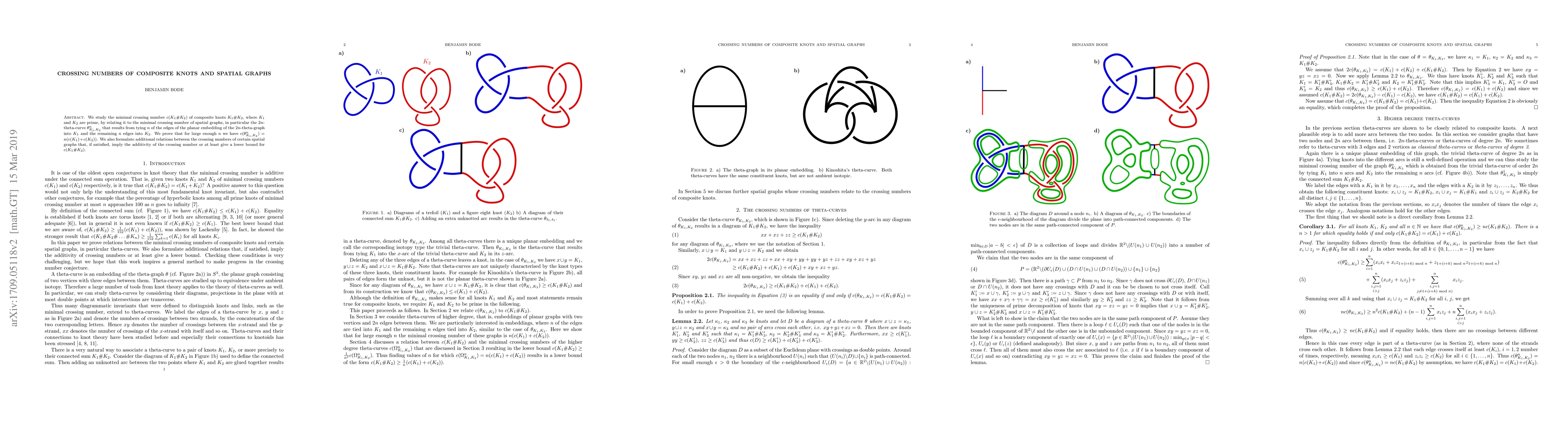 We study the minimal crossing number $c(K_{1}\# K_{2})$ of composite knots $K_{1}\# K_{2}$, where $K_1$ and $K_2$ are prime, by relating it to the minimal crossing number of spatial graphs, in particular the $2n$-theta curve $\theta_{K_{1},K_{2}}^n$ that results from tying $n$ of the edges of the planar embedding of the $2n$-theta graph into $K_1$ and the remaining $n$ edges into $K_2$. We prove that for large enough $n$ we have $c(\theta_{K_1,K_2}^n)=n(c(K_1)+c(K_2))$. We also formulate additional relations between the crossing numbers of certain spatial graphs that, if satisfied, imply the additivity of the crossing number or at least give a lower bound for $c(K_1\# K_2)$.