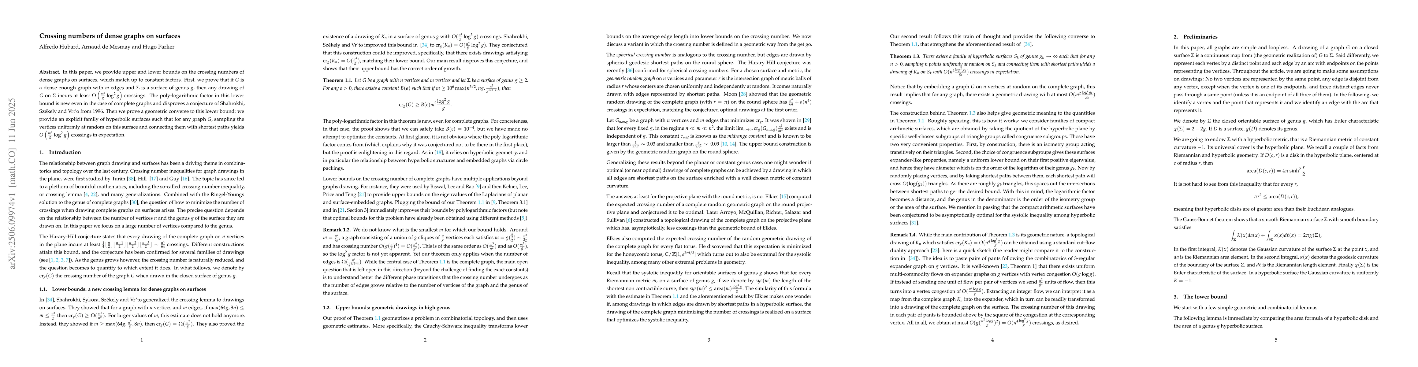 In this paper, we provide upper and lower bounds on the crossing numbers of dense graphs on surfaces, which match up to constant factors. First, we prove that if $G$ is a dense enough graph with $m$ edges and $\Sigma$ is a surface of genus $g$, then any drawing of $G$ on $\Sigma$ incurs at least $\Omega \left(\frac{m^2}{g} \log ^2 g\right)$ crossings. The poly-logarithmic factor in this lower bound is new even in the case of complete graphs and disproves a conjecture of Shahrokhi, Sz\'ekely and Vrt'o from 1996. Then we prove a geometric converse to this lower bound: we provide an explicit family of hyperbolic surfaces such that for any graph $G$, sampling the vertices uniformly at random on this surface and connecting them with shortest paths yields $O\left(\frac{m^2}{g} \log ^2 g\right)$ crossings in expectation.