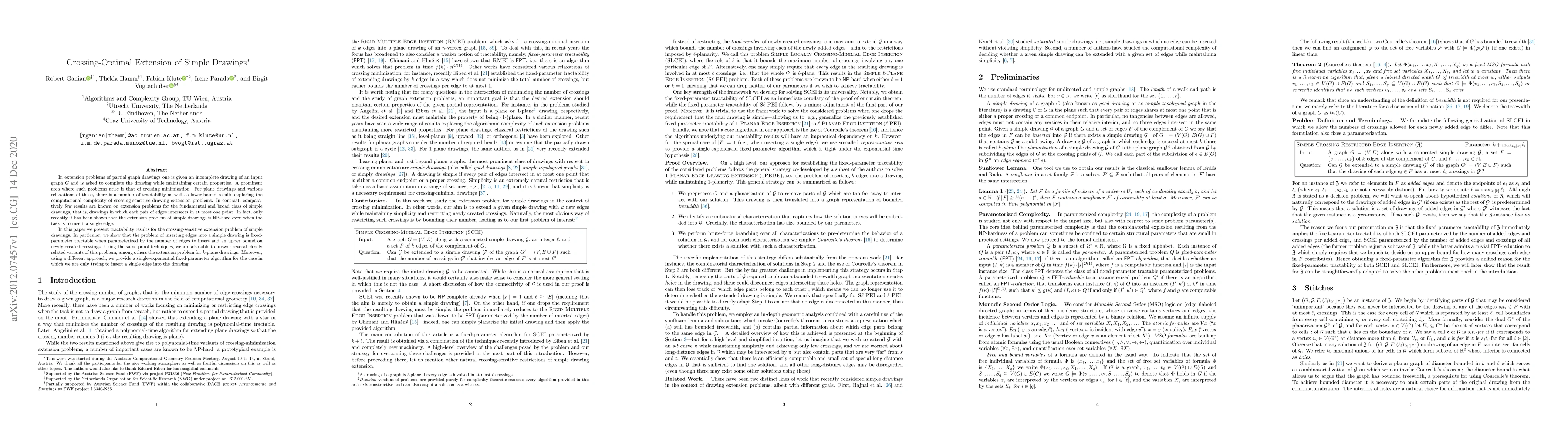 Researchers found that inserting edges into simple drawings is tractable when parameterized by the number of edges to insert and an upper bound on newly created crossings.
