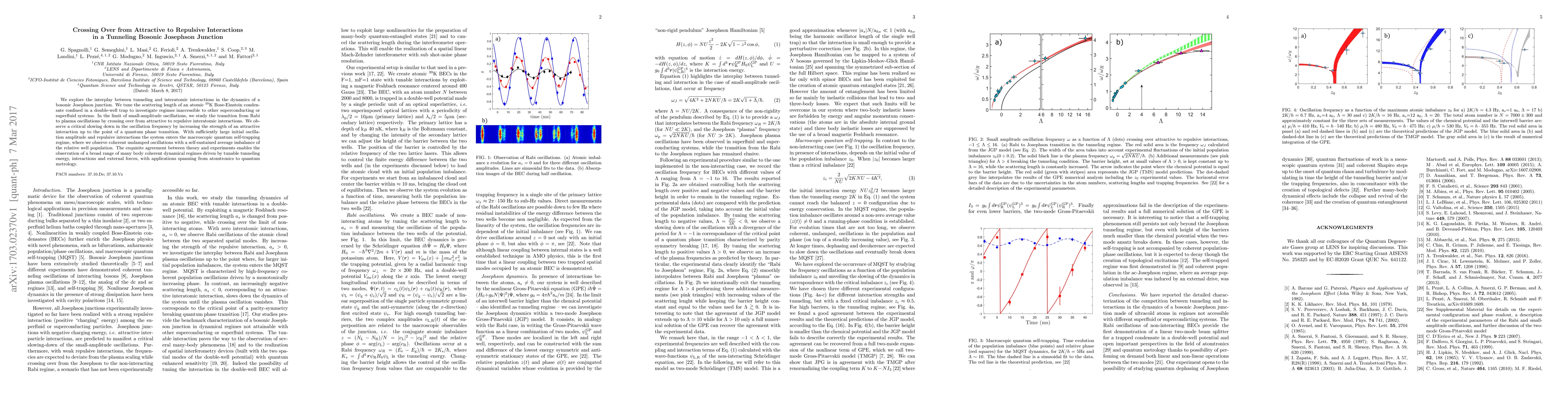 This research investigates the dynamics of a bosonic Josephson junction, exploring how tunneling and interatomic interactions influence the transition from Rabi to plasma oscillations. By tuning the scattering length in a $^{39}$K Bose-Einstein condensate, the study observes a quantum phase transition and transitions to a macroscopic quantum self-trapping regime, demonstrating broad applications in quantum technologies.