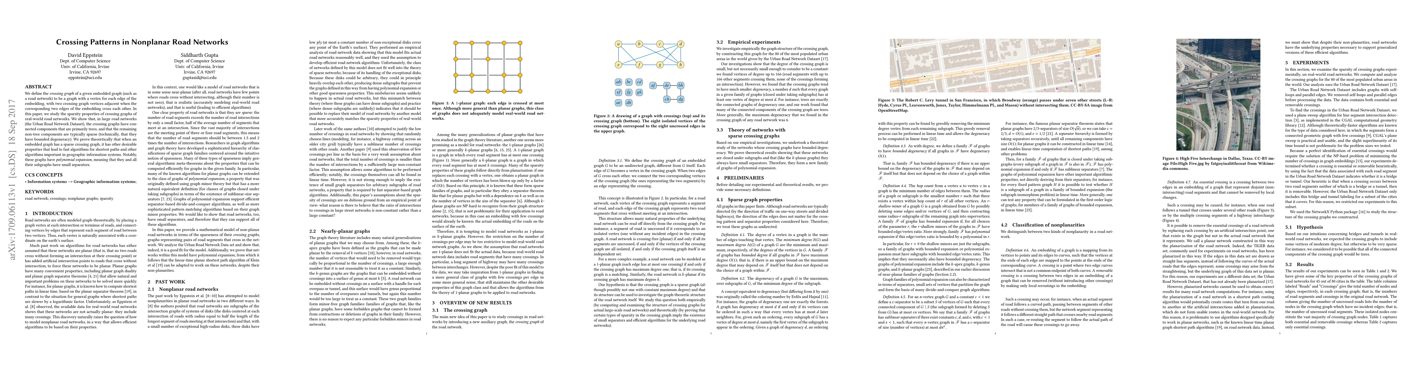We define the crossing graph of a given embedded graph (such as a road network) to be a graph with a vertex for each edge of the embedding, with two crossing graph vertices adjacent when the corresponding two edges of the embedding cross each other. In this paper, we study the sparsity properties of crossing graphs of real-world road networks. We show that, in large road networks (the Urban Road Network Dataset), the crossing graphs have connected components that are primarily trees, and that the remaining non-tree components are typically sparse (technically, that they have bounded degeneracy). We prove theoretically that when an embedded graph has a sparse crossing graph, it has other desirable properties that lead to fast algorithms for shortest paths and other algorithms important in geographic information systems. Notably, these graphs have polynomial expansion, meaning that they and all their subgraphs have small separators.