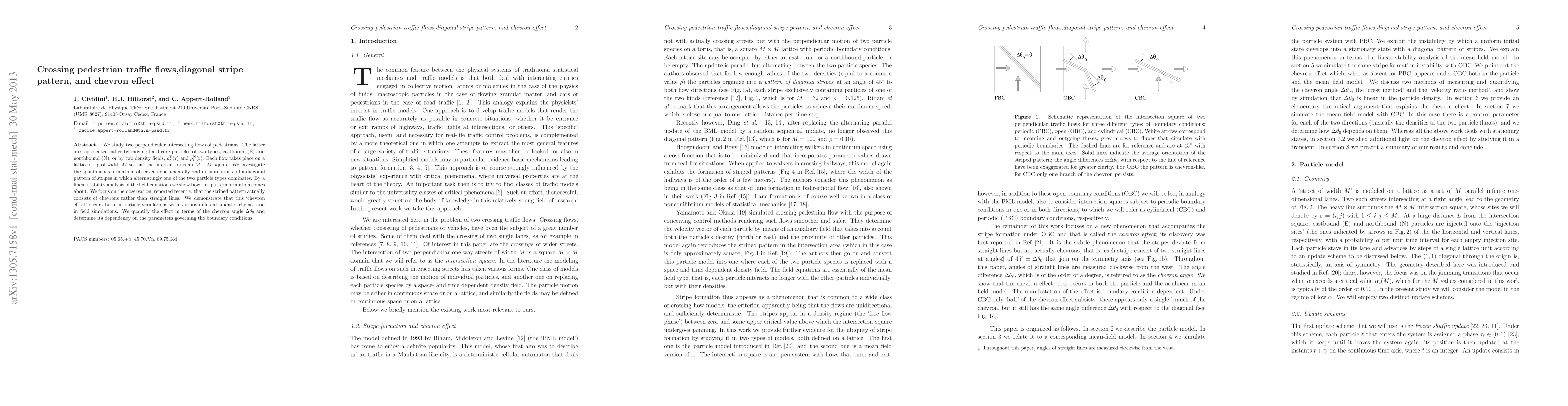 This paper explores the spontaneous formation of diagonal stripe patterns in intersecting pedestrian flows, demonstrating that these patterns are actually chevrons rather than straight lines. The study uses both particle and density field simulations to show the chevron effect's occurrence and dependency on boundary conditions.