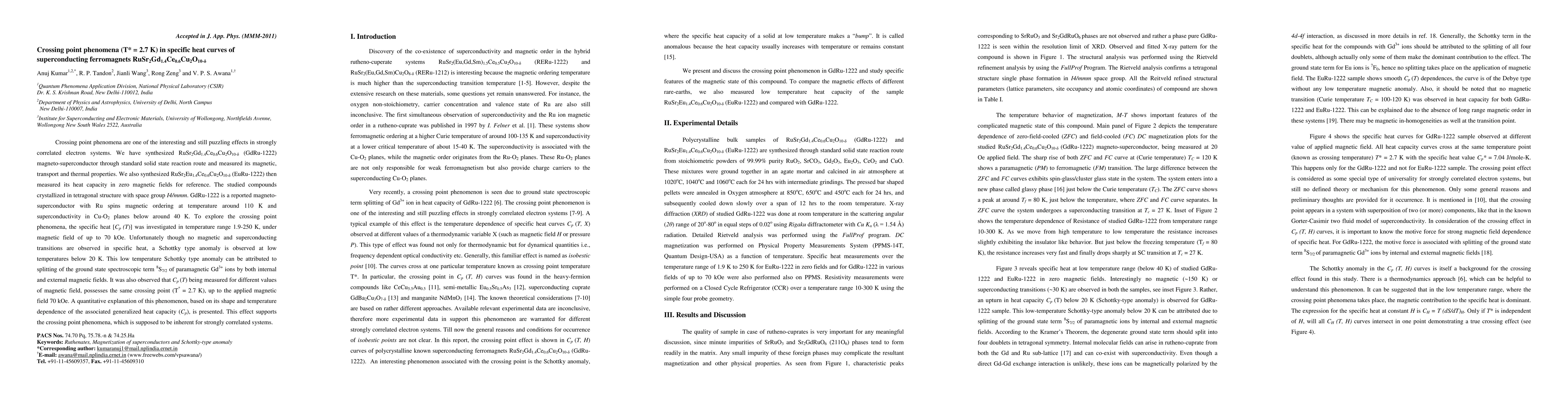 Crossing point phenomena are one of the interesting and still puzzling effects in strongly correlated electron systems. We have synthesized RuSr2Gd1.4Ce0.6Cu2O10-{\delta} (GdRu-1222) magneto-superconductor through standard solid state reaction route and measured its magnetic, transport and thermal properties. We also synthesized RuSr2Eu1.4Ce0.6Cu2O10-{\delta} (EuRu-1222) then measured its heat capacity in zero magnetic fields for reference. The studied compounds crystallized in tetragonal structure with space group I4/mmm. GdRu-1222 is a reported magneto-superconductor with Ru spins magnetic ordering at temperature around 110 K and superconductivity in Cu-O2 planes below around 40 K. To explore the crossing point phenomena, the specific heat [Cp (T)] was investigated in temperature range 1.9-250 K, under magnetic field of up to 70 kOe. Unfortunately though no magnetic and superconducting transitions are observed in specific heat, a Schottky type anomaly is observed at low temperatures below 20 K. This low temperature Schottky type anomaly can be attributed to splitting of the ground state spectroscopic term 8S7/2 of paramagnetic Gd3+ ions by both internal and external magnetic fields. It was also observed that Cp (T) being measured for different values of magnetic field, possesses the same crossing point (T* = 2.7 K), up to the applied magnetic field 70 kOe. A quantitative explanation of this phenomenon, based on its shape and temperature dependence of the associated generalized heat capacity (Cp), is presented. This effect supports the crossing point phenomena, which is supposed to be inherent for strongly correlated systems.