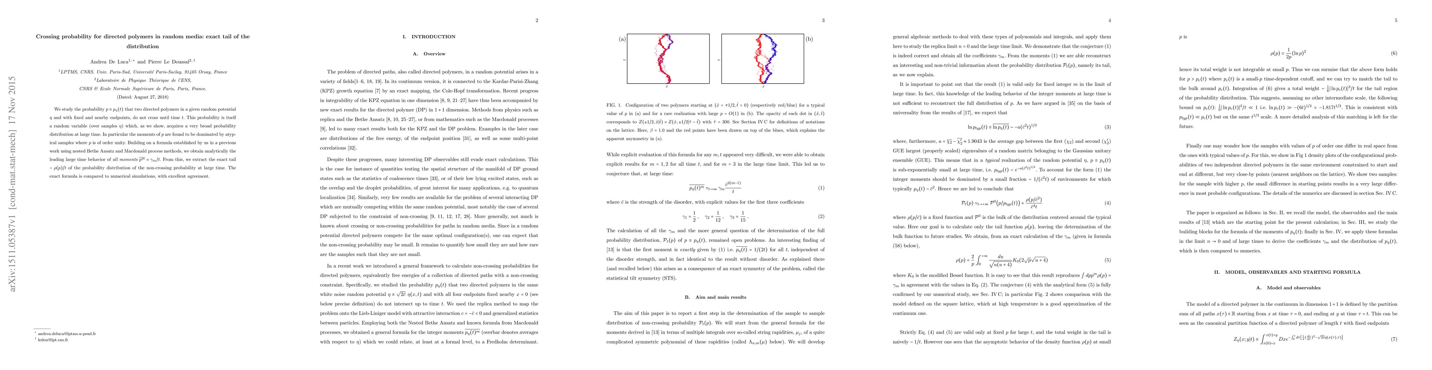 This paper investigates the probability that two directed polymers in random media do not cross until time $t$, revealing a broad distribution dominated by atypical samples. The exact tail of this distribution is analytically derived and confirmed through numerical simulations.