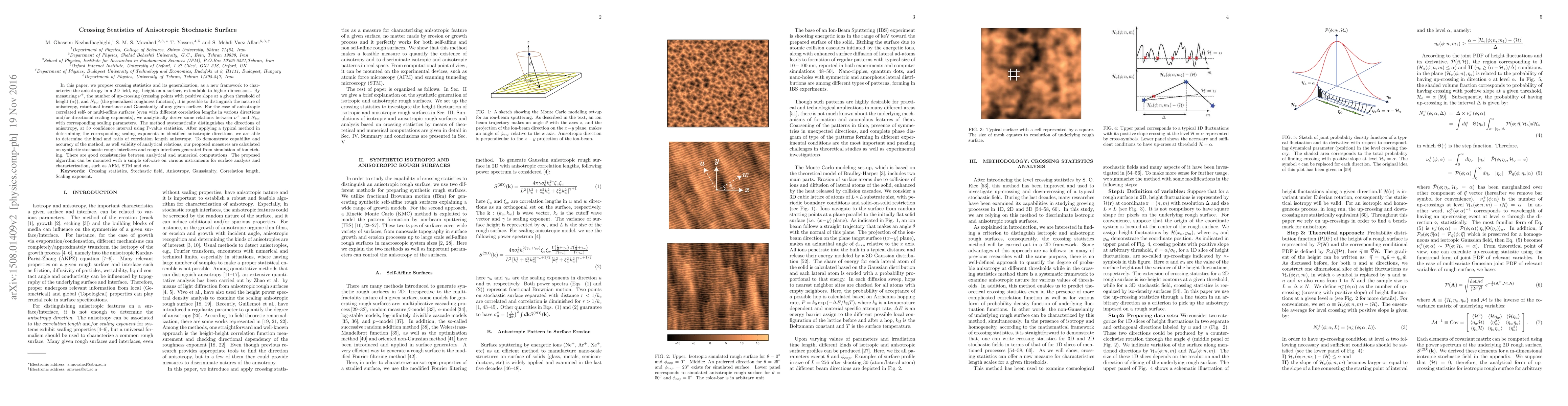 In this paper, we propose crossing statistics and its generalization, as a new framework to characterize the anisotropy in a 2D field, e.g. height on a surface, extendable to higher dimensions. By measuring $\nu^+$, the number of up-crossing (crossing points with positive slope at a given threshold of height ($\alpha$)), and $N_{tot}$ (the generalized roughness function), it is possible to distinguish the nature of anisotropy, rotational invariance and Gaussianity of any given surface. For the case of anisotropic correlated self- or multi-affine surfaces (even with different correlation lengths in various directions and/or directional scaling exponents), we analytically derive some relations between $\nu^+$ and $N_{tot}$ with corresponding scaling parameters. The method systematically distinguishes the directions of anisotropy, at $3\sigma$ confidence interval using P-value statistics. After applying a typical method in determining the corresponding scaling exponents in identified anisotropic directions, we are able to determine the kind and ratio of correlation length anisotropy. To demonstrate capability and accuracy of the method, as well validity of analytical relations, our proposed measures are calculated on synthetic stochastic rough interfaces and rough interfaces generated from simulation of ion etching. There are good consistencies between analytical and numerical computations. The proposed algorithm can be mounted with a simple software on various instruments for surface analysis and characterization, such as AFM, STM and etc.