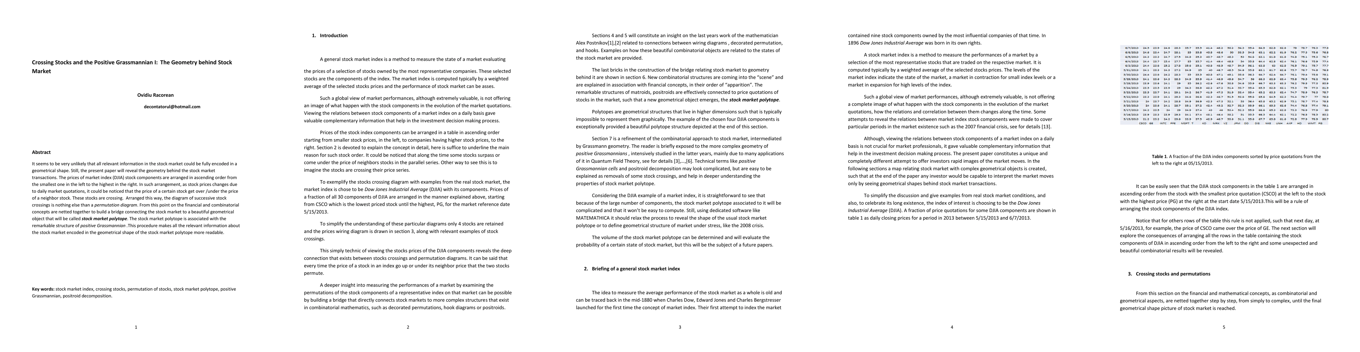 It seems to be very unlikely that all relevant information in the stock market could be fully encoded in a geometrical shape. Still,the present paper will reveal the geometry behind the stock market transactions. The prices of market index (DJIA) stock components are arranged in ascending order from the smallest one in the left to the highest in the right. In such arrangement, as stock prices changes due to daily market quotations, it could be noticed that the price of a certain stock get over /under the price of a neighbor stock. These stocks are crossing. Arranged this way, the diagram of successive stock crossings is nothing else than a permutation diagram. From this point on the financial and combinatorial concepts are netted together to build a bridge connecting the stock market to a beautiful geometrical object that will be called stock market polytope. The stock market polytope is associated with the remarkable structure of positive Grassmannian . This procedure makes all the relevant information about the stock market encoded in the geometrical shape of the stock market polytope more readable.