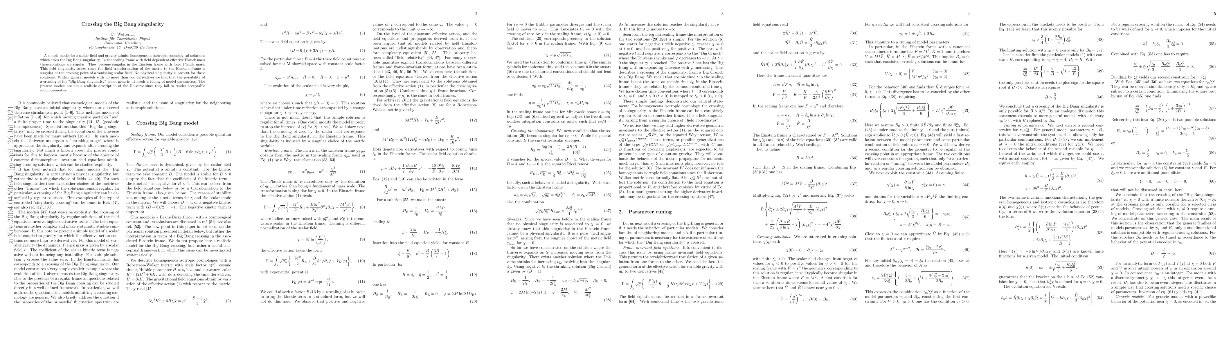 A simple model for a scalar field and gravity admits homogeneous isotropic cosmological solutions which cross the Big Bang singularity. In the scaling frame with field dependent effective Planck mass these solutions are regular. They become singular in the Einstein frame with fixed Planck mass. This field singularity arises since the field transformation of the metric to the Einstein frame is singular at the crossing point of a vanishing scalar field. No physical singularity is present for these solutions. Within general models with no more than two derivatives we find that the possibility of a crossing of the "Big Bang singularity" is not generic. It needs a tuning of model parameters. The present models are not a realistic description of the Universe since they fail to render acceptable inhomogeneities.