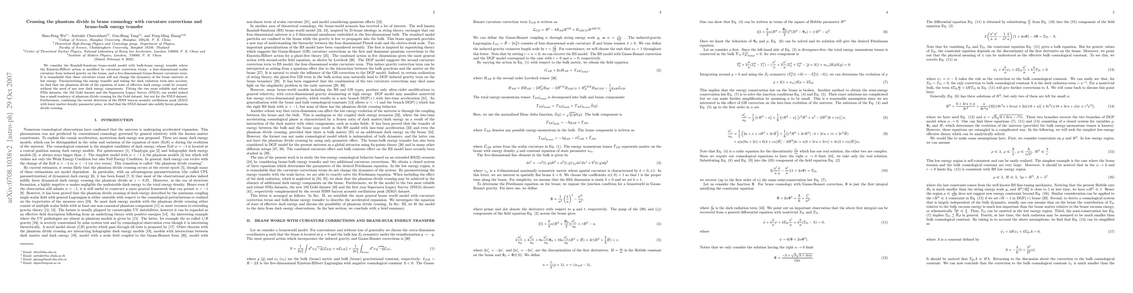 This paper explores the Randall-Sundrum brane-world model with curvature corrections and brane-bulk energy transfer, finding that phantom divide crossing in effective dark energy is possible without new components. The model shows a slight tendency for phantom divide crossing in the Gold dataset but not in the SNLS dataset, with mild support from the SNLS dataset when combined with BAO data.