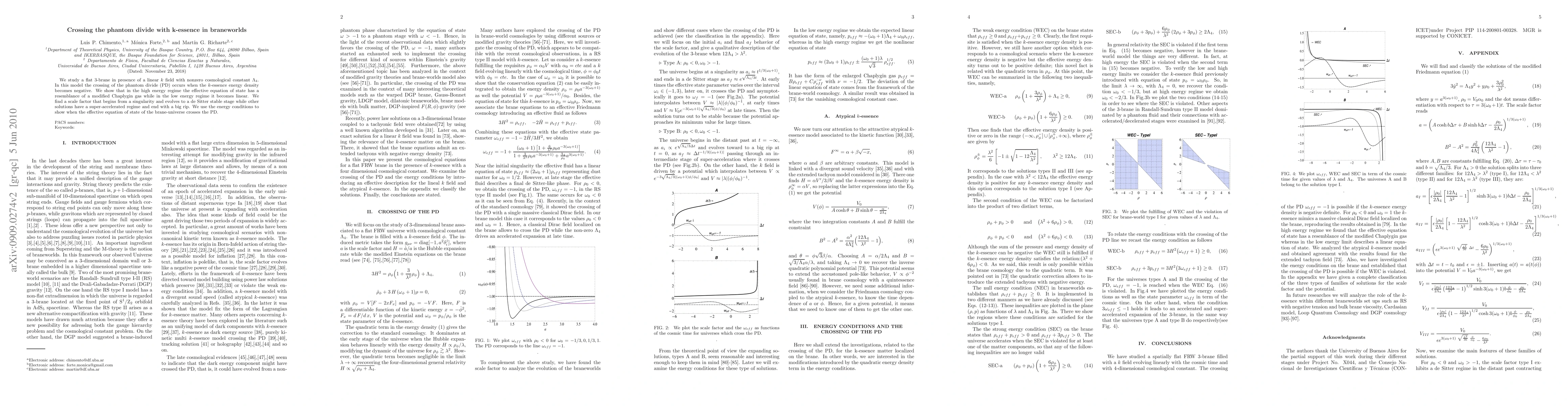 We study a flat 3-brane in presence of a linear $k$ field with nonzero cosmological constant $\Lambda_{4}$. In this model the crossing of the phantom divide (PD) occurs when the $k$-essence energy density becomes negative. We show that in the high energy regime the effective equation of state has a resemblance of a modified Chaplygin gas while in the low energy regime it becomes linear. We find a scale factor that begins from a singularity and evolves to a de Sitter stable stage while other solutions have a super-accelerated regime and end with a big rip. We use the energy conditions to show when the effective equation of state of the brane-universe crosses the PD.