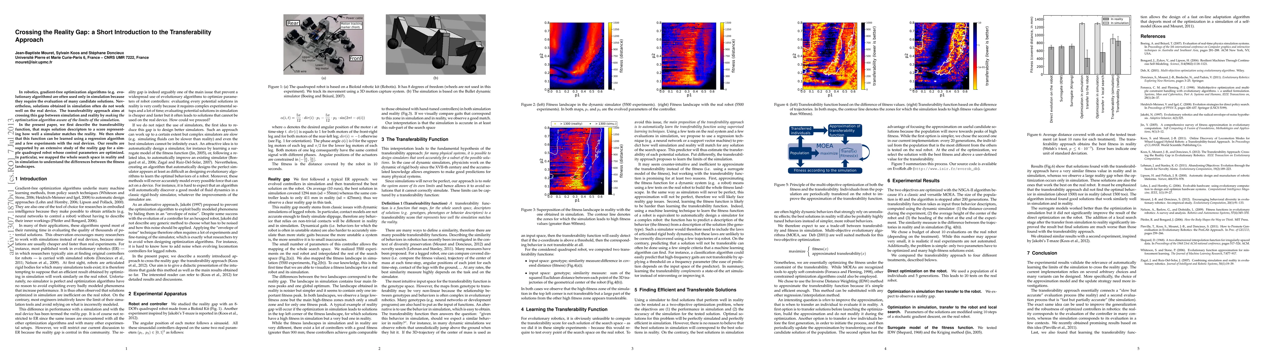 This paper introduces the transferability approach to bridge the "reality gap" in robotics, where simulation-based optimization often fails in real-world applications. It proposes a transferability function that can be learned to map simulation results to real-world performance, demonstrated through optimizing control parameters for a quadruped robot.
