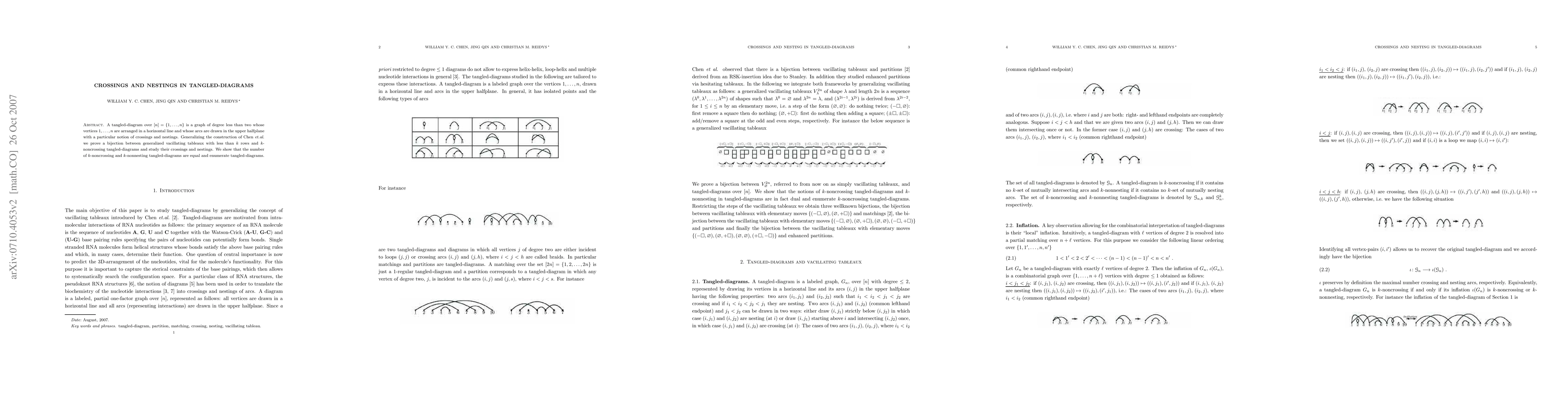 A tangled-diagram over $[n]=\{1,...,n\}$ is a graph of degree less than two whose vertices $1,...,n$ are arranged in a horizontal line and whose arcs are drawn in the upper halfplane with a particular notion of crossings and nestings. Generalizing the construction of Chen {\it et.al.} we prove a bijection between generalized vacillating tableaux with less than $k$ rows and $k$-noncrossing tangled-diagrams and study their crossings and nestings. We show that the number of $k$-noncrossing and $k$-nonnesting tangled-diagrams are equal and enumerate tangled-diagrams.