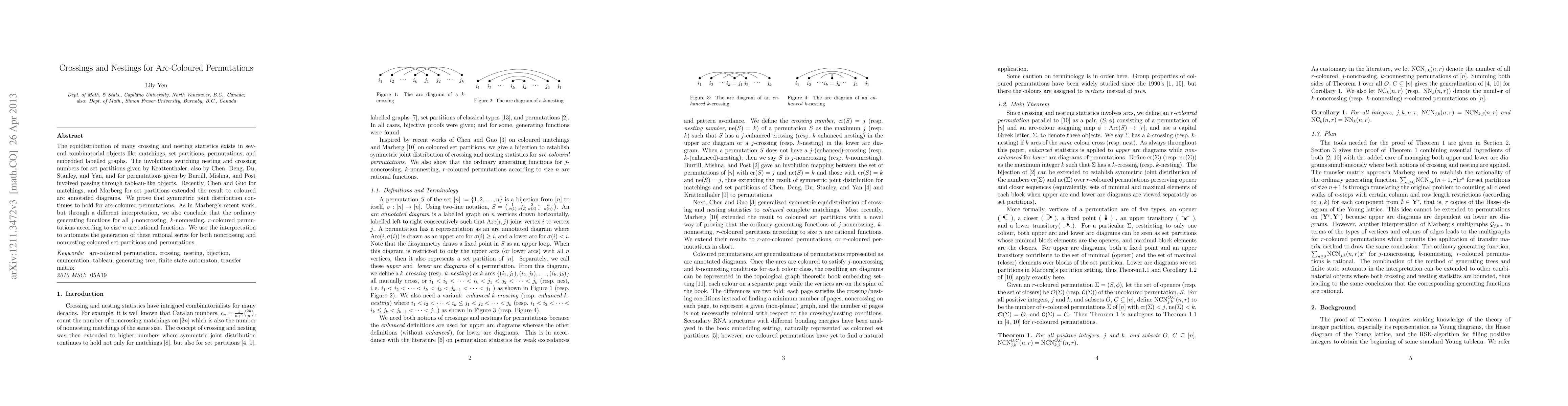 The equidistribution of many crossing and nesting statistics exists in several combinatorial objects like matchings, set partitions, permutations, and embedded labelled graphs. The involutions switching nesting and crossing numbers for set partitions given by Krattenthaler, also by Chen, Deng, Du, Stanley, and Yan, and for permutations given by Burrill, Mishna, and Post involved passing through tableau-like objects. Recently, Chen and Guo for matchings, and Marberg for set partitions extended the result to coloured arc annotated diagrams. We prove that symmetric joint distribution continues to hold for arc-coloured permutations. As in Marberg's recent work, but through a different interpretation, we also conclude that the ordinary generating functions for all $j$-noncrossing, $k$-nonnesting, $r$-coloured permutations according to size $n$ are rational functions. We use the interpretation to automate the generation of these rational series for both noncrossing and nonnesting coloured set partitions and permutations.