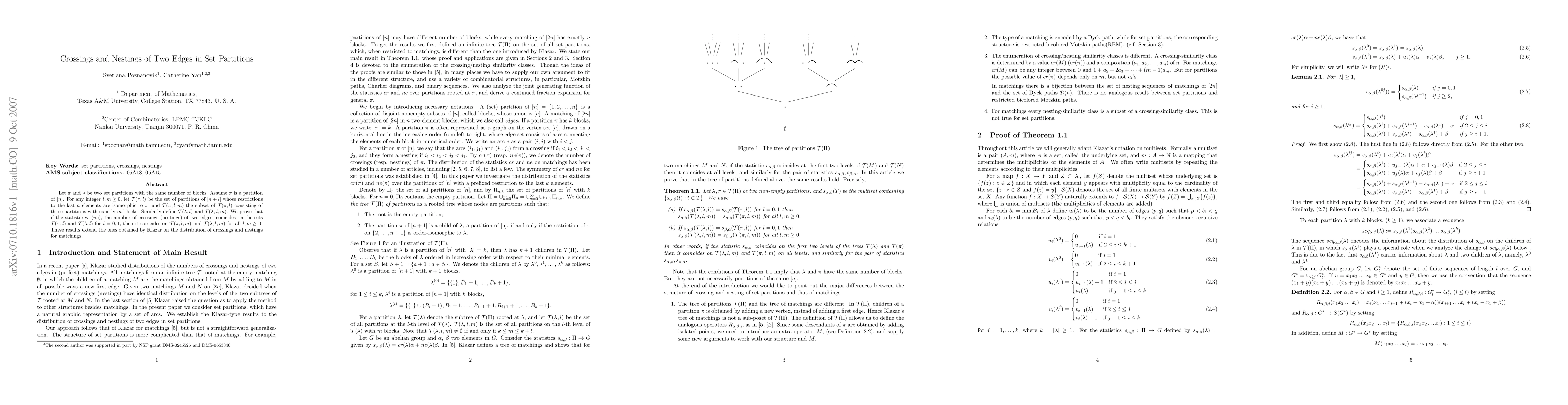 Let $\pi$ and $\lambda$ be two set partitions with the same number of blocks. Assume $\pi$ is a partition of $[n]$. For any integer $l, m \geq 0$, let $\mathcal{T}(\pi, l)$ be the set of partitions of $[n+l]$ whose restrictions to the last $n$ elements are isomorphic to $\pi$, and $\mathcal{T}(\pi, l, m)$ the subset of $\mathcal{T}(\pi,l)$ consisting of those partitions with exactly $m$ blocks. Similarly define $\mathcal{T}(\lambda, l)$ and $\mathcal{T}(\lambda, l,m)$. We prove that if the statistic $cr$ ($ne$), the number of crossings (nestings) of two edges, coincides on the sets $\mathcal{T}(\pi, l)$ and $\mathcal{T}(\lambda, l)$ for $l =0, 1$, then it coincides on $\mathcal{T}(\pi, l,m)$ and $\mathcal{T}(\lambda, l,m)$ for all $l, m \geq 0$. These results extend the ones obtained by Klazar on the distribution of crossings and nestings for matchings.
