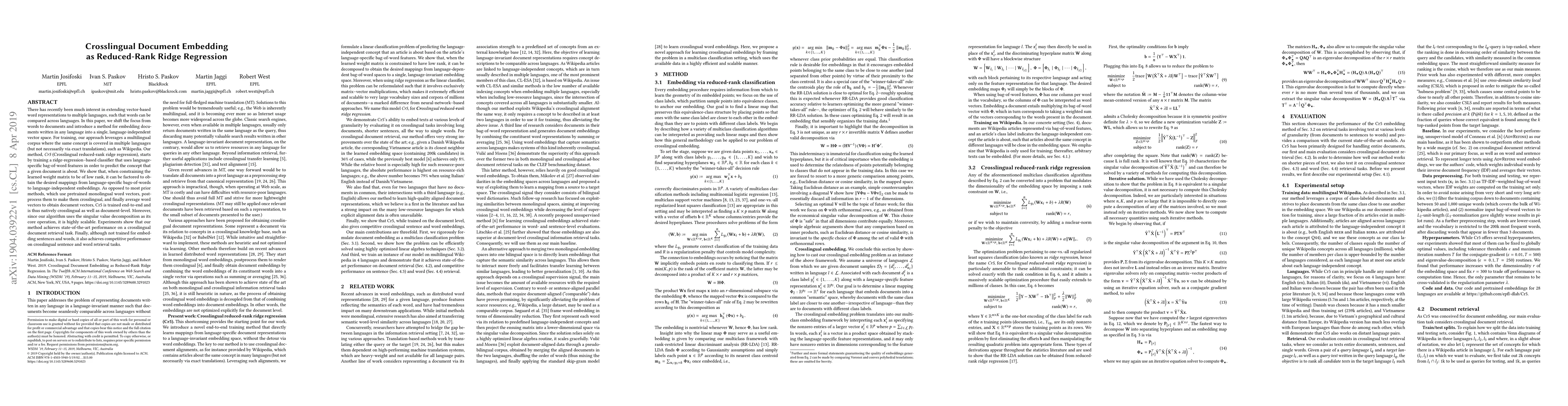This paper introduces Cr5, a method for embedding multilingual documents into a single vector space using reduced-rank ridge regression. Unlike previous approaches, Cr5 is trained end-to-end and achieves state-of-the-art performance on crosslingual document retrieval, while also showing competitive results on sentence and word retrieval tasks.